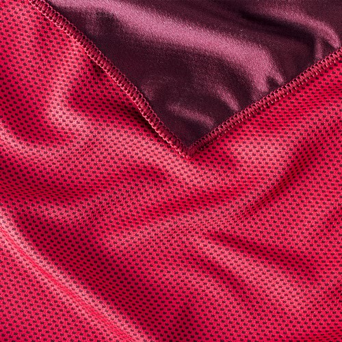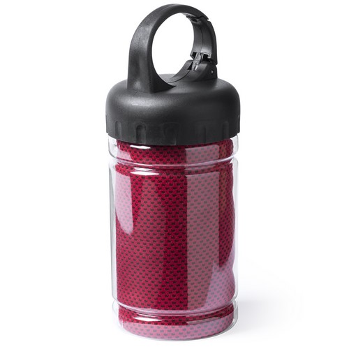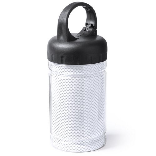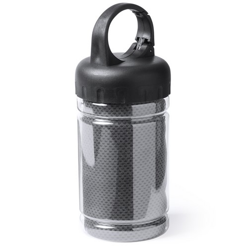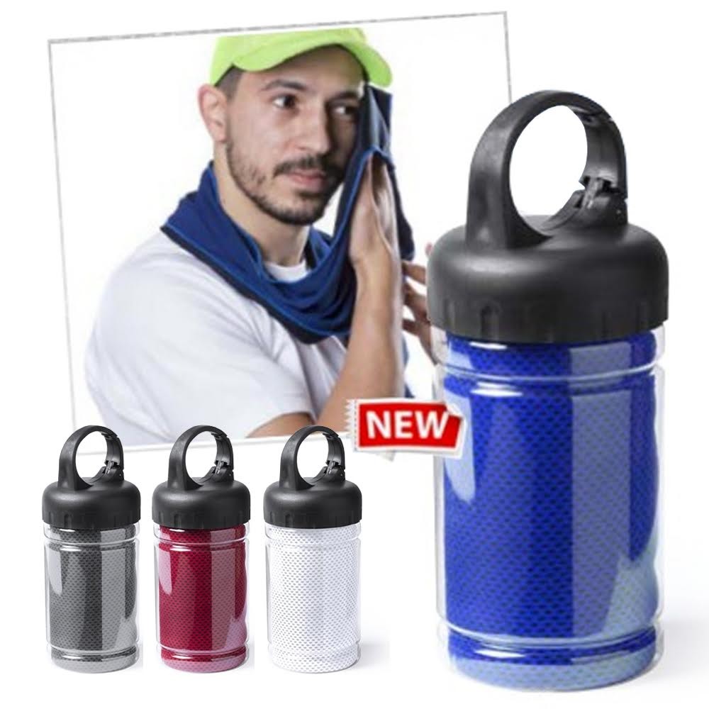 Toalla de 90x30cm en material refrigerante SoftCool Extreme con protección UV50. De 160g/m2 y presentada en estuche individual transparente con asa mosquetón de transporte integrada en tapa.