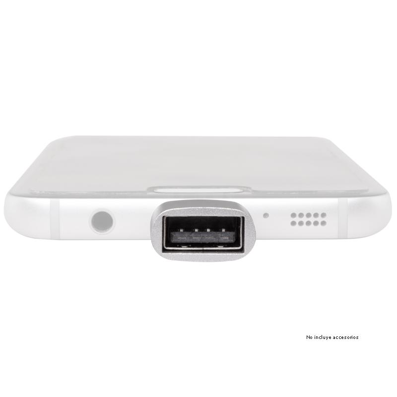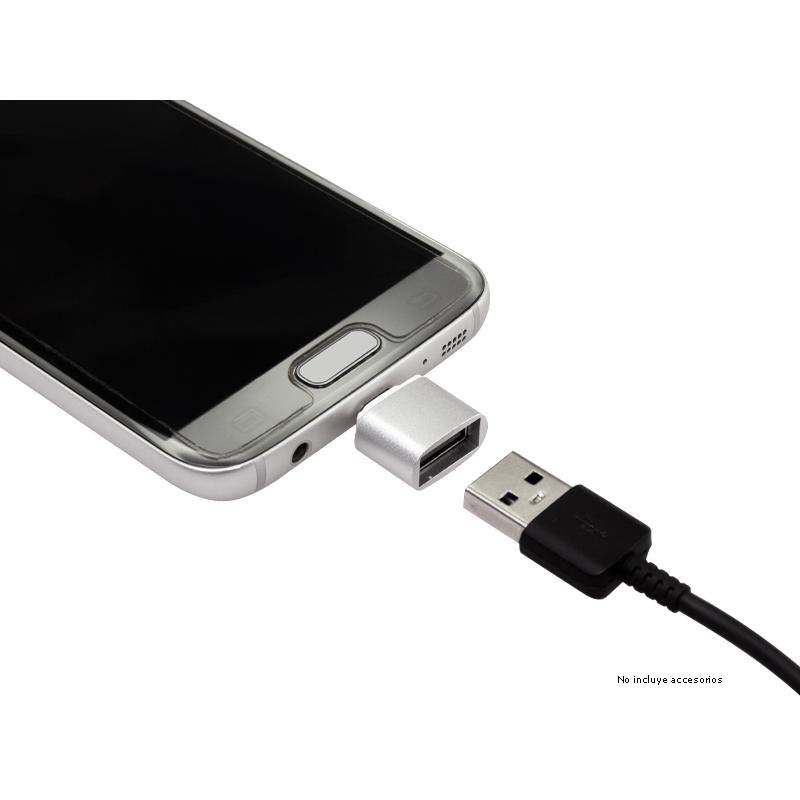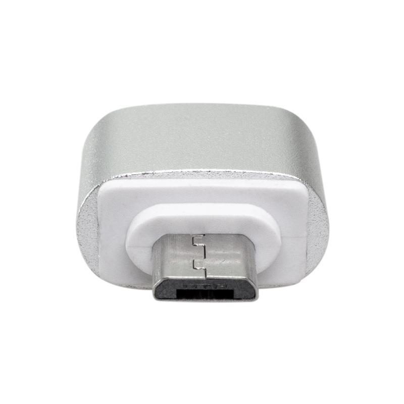 Adaptador USB-Micro USB (OTG-B), con cuerpo metálico plateado.