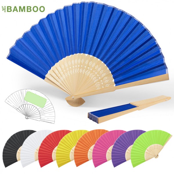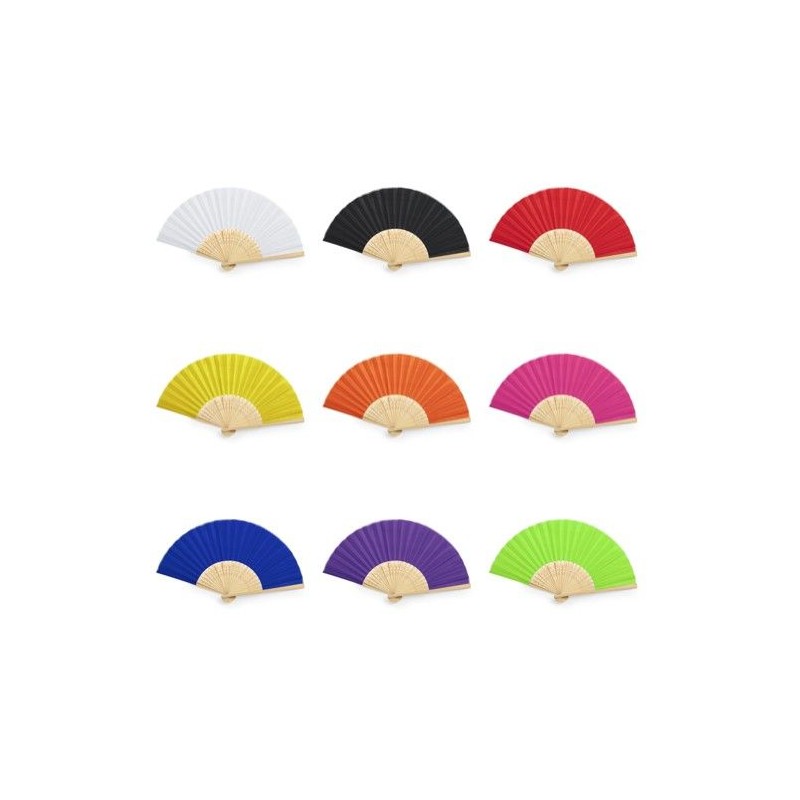 Abanico de línea nature con tela en resistente poliéster 190T. Varillas fabricadas en flexible bambú. Disponible en variada gama de colores.