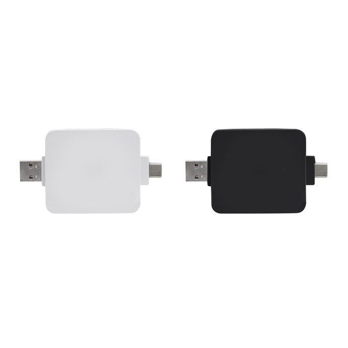 Mini adaptador HUB multipuerto. Entrada: 1 x USB-A / 1 x USB-C. Salida: 2 x USB-A / 2 x USB-C con conectores rebatibles.