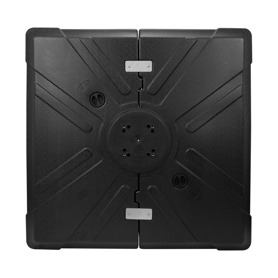 Base cuadrada de plástico HDPE rígido, rellenable (con agua, arena o piedrecillas, para darle mayor peso), con una capacidad total de 180kg o 180L. Incluye 2 ruedas, para fácil traslado y movimiento del quitasol.