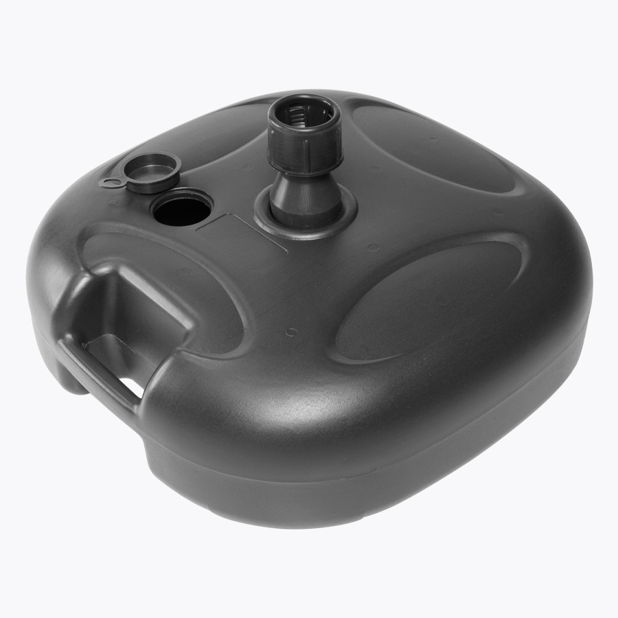 Base plástica cuadrada rellenable (con agua, arena o piedrecilla, para darle mayor peso), con una capacidad total de 18kg o 18L.