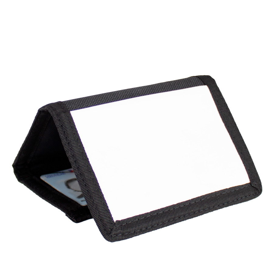 Billetera de nylon y poliéster color negro, con ventana de nylon blanco de 10.2 x 6.8 cm, para Sublimación. Presentación en bolsa PP translúcido.