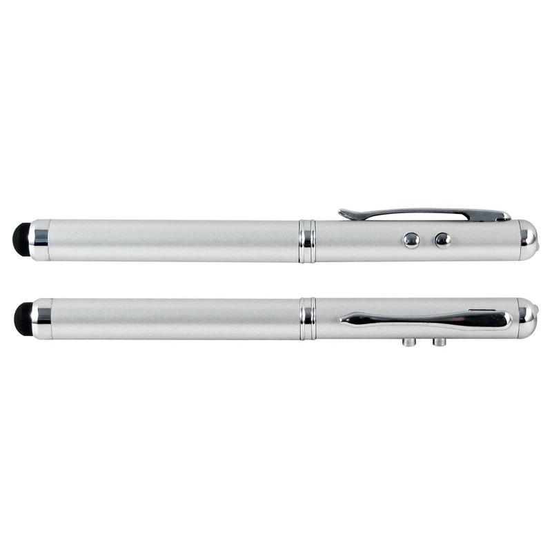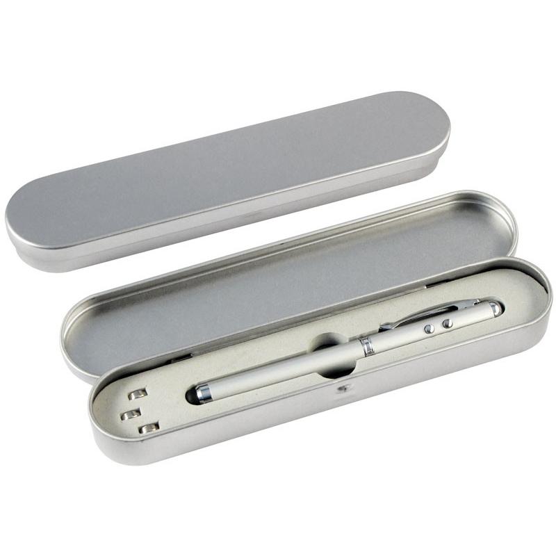 Bolígrafo metálico multi-función 4 en 1. Incluye bolígrafo, linterna LED, puntero láser y NUEVO puntero “Touch-Screen” para pantallas táctiles. Presentación en estuche de aluminio. Escritura Azul.