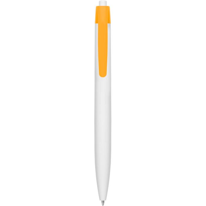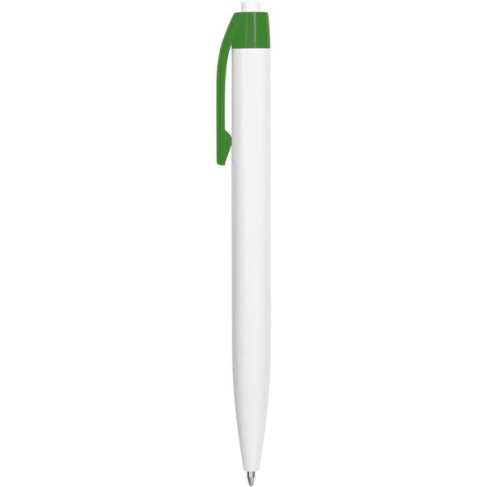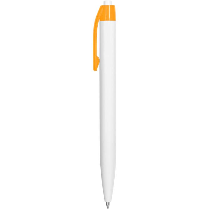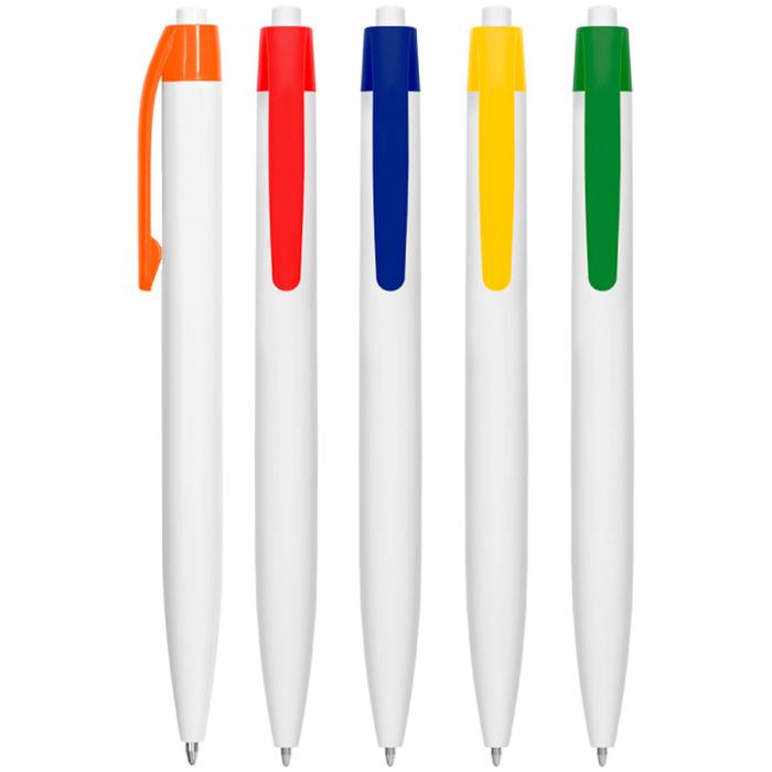 Plástico. Bolígrafo con cuerpo y pulsador de color blanco y clip en color. Tinta negra.