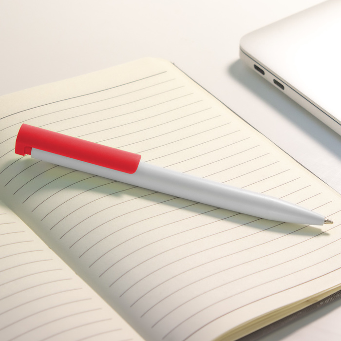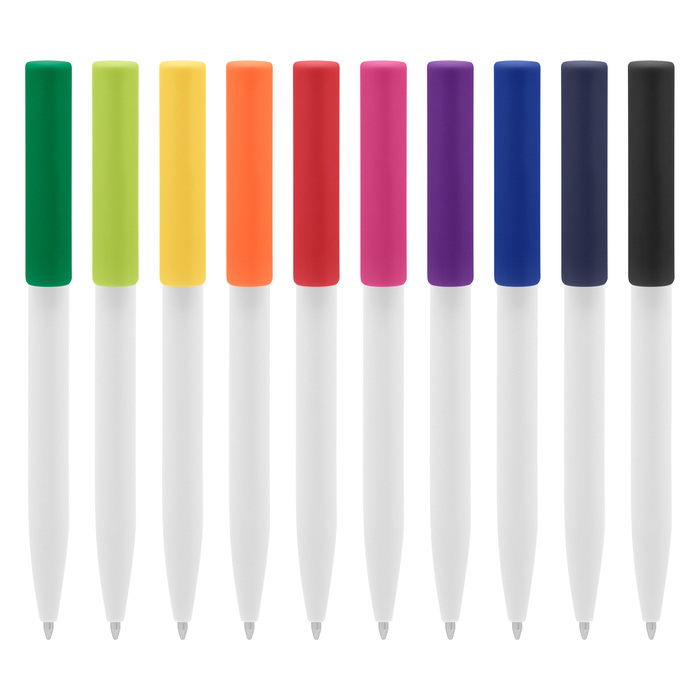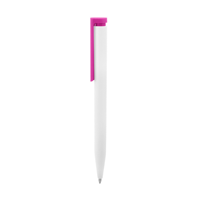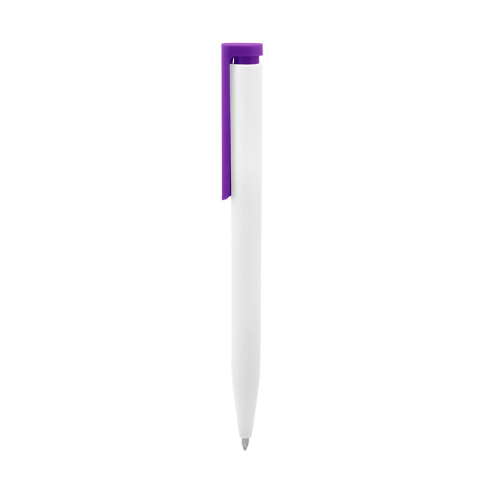 Bolígrafo de plástico. Cuerpo blanco y clip de diferentes colores. Bolígrafo retráctil. Clip plástico de colores. Tinta negra. Sistema de botón push para destapar. Amplia área de impresión.
