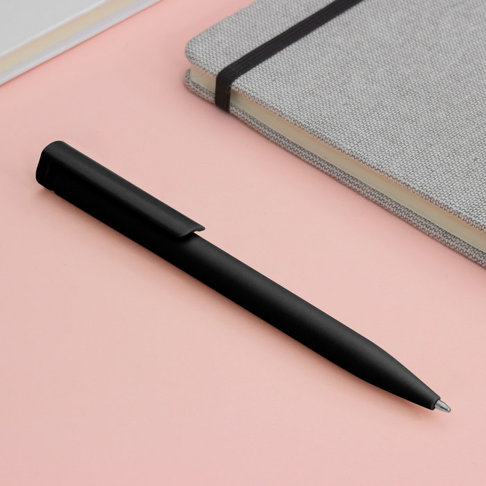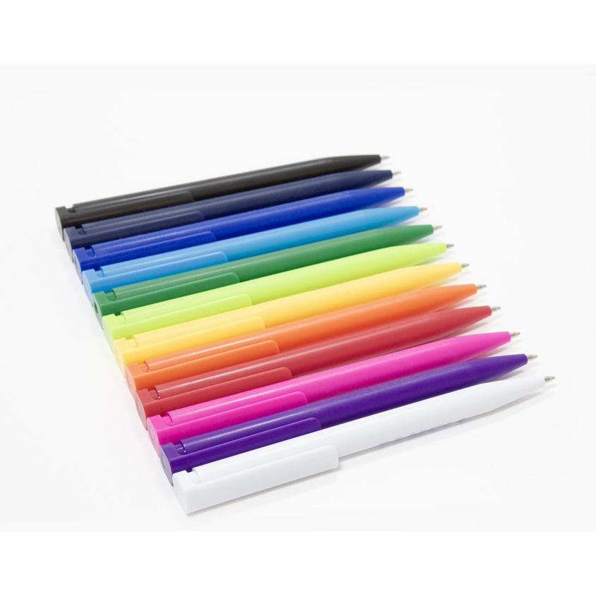 Bolígrafo de plástico retráctil. Cuerpo de diferentes colores. Clip plástico del mismo color del cuerpo. Tinta negra. Sistema de botón push para destapar. Amplia área de impresión.