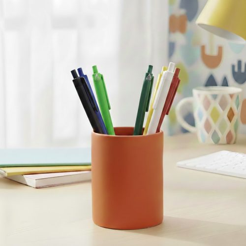 Bolígrafo de plástico retráctil. Cuerpo de diferentes colores. Clip plástico del mismo color del cuerpo. Tinta negra. Sistema de botón push para destapar. Amplia área de impresión.