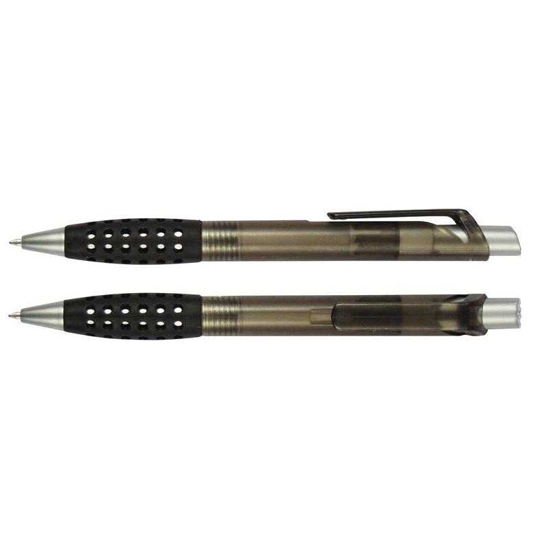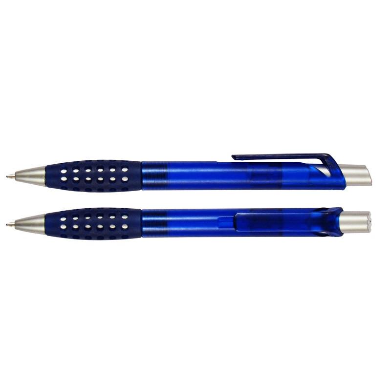 Bolígrafo plástico modelo “Punch” con grip de goma con orificios. Escritura azul.