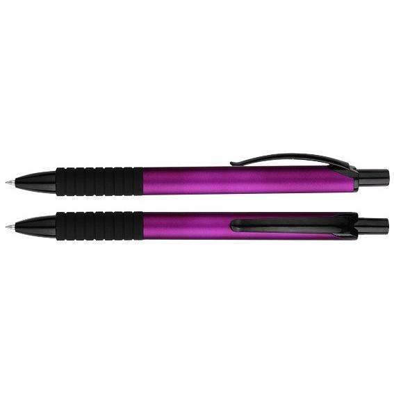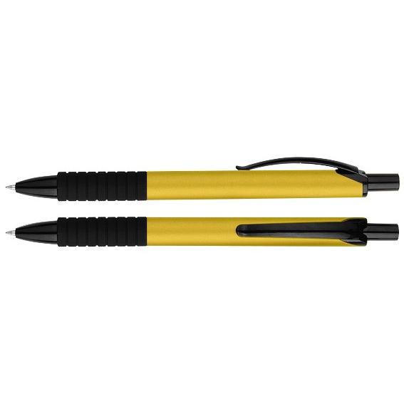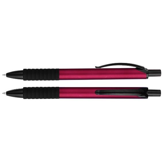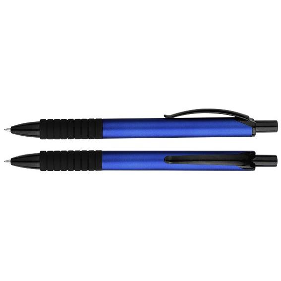 Bolígrafo “Vulcano” con cuerpo de color metalizado opaco y terminales negros. Escritura azul.