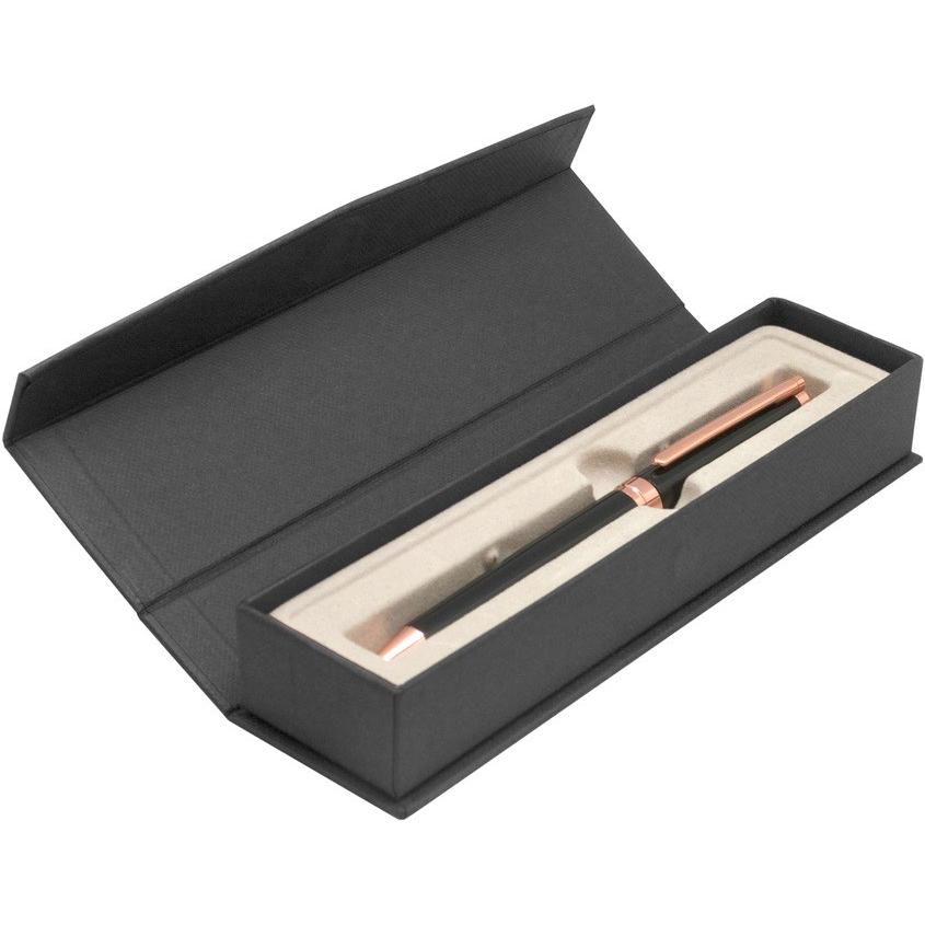 Ø 1 x 13,6 cm. Metálico. Bolígrafo con apertura giratoria. Destape cobre en la parte de arriba. Cuerpo negro. Detalles en clip, arco circular y punta color cobre. Tinta negra. Estuche con cierre imnatado.