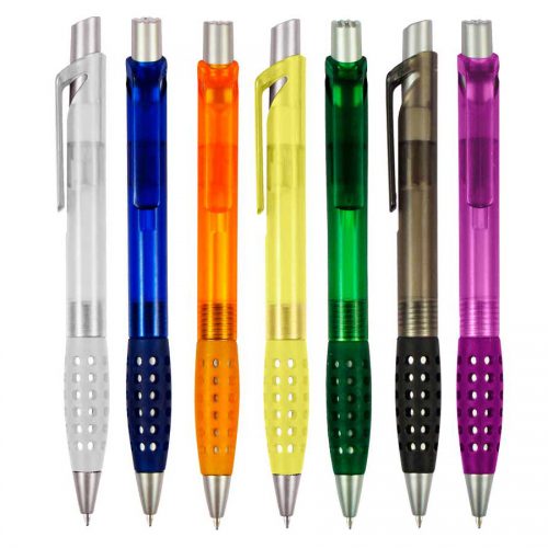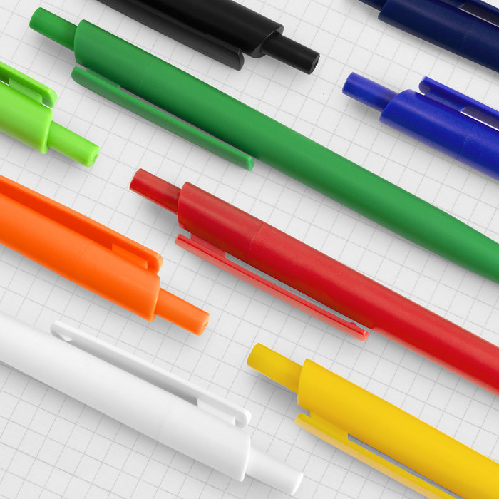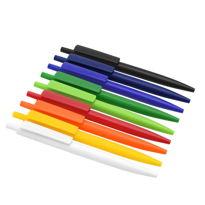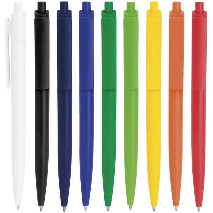 Bolígrafo retráctil. Cuerpo de diferentes colores. Acabado mate. Pulsador, clip y puntera del mismo color del cuerpo. Amplia área de impresión.