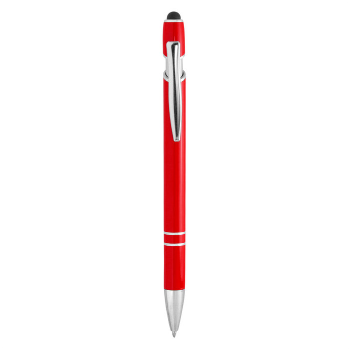 Bolígrafo retráctil con pulsador touch. Metálico. Cuerpo de aluminio de diferentes colores con acabado laca. Puntera, anillos, clip y detalles del pulsador en plateado brillante.