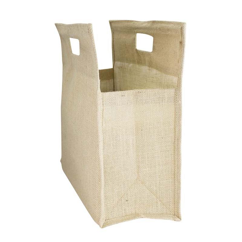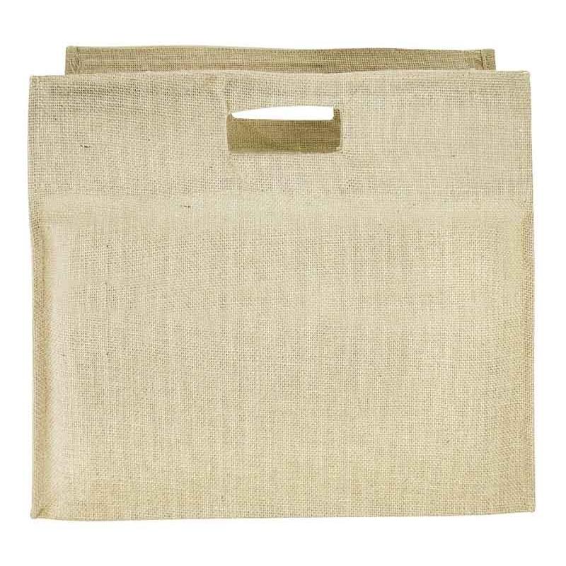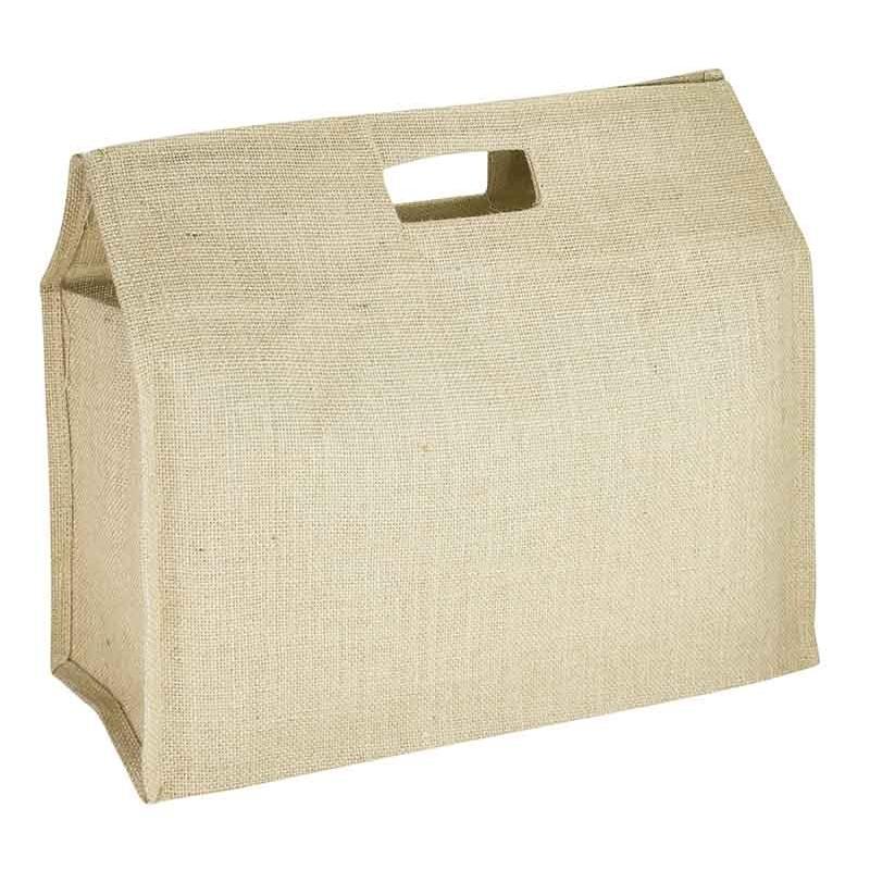 Bolsa de Yute modelo “Biosfera”, con recubrimiento laminado interior. Fuelle de yute. Parte superior reforzada con doble tela yute y manillas troqueladas.