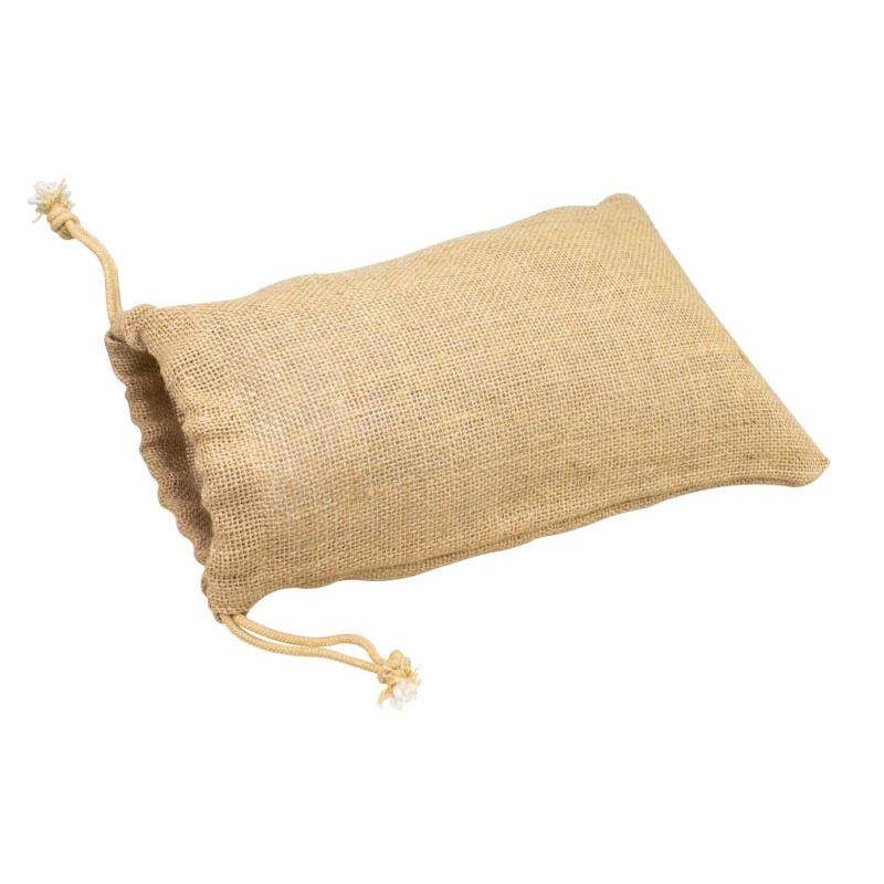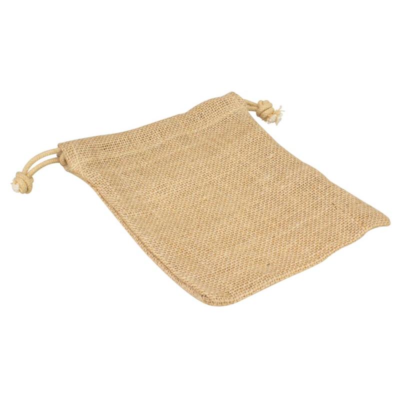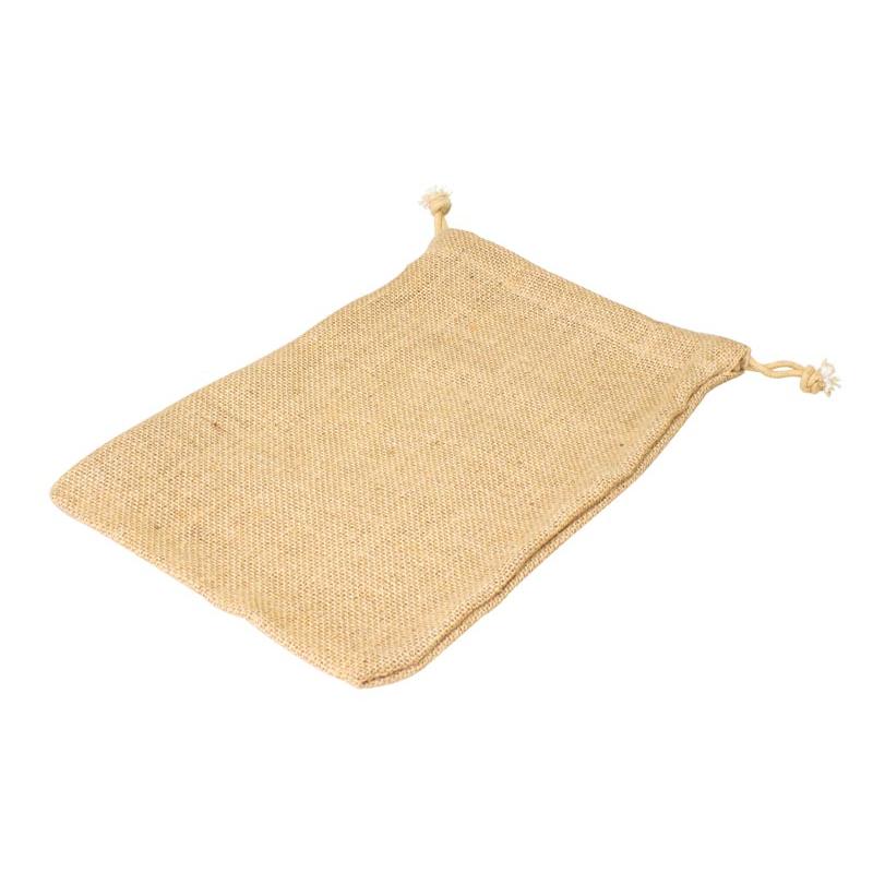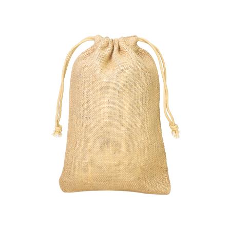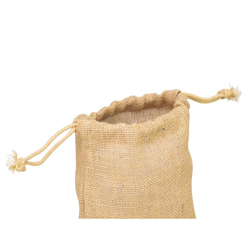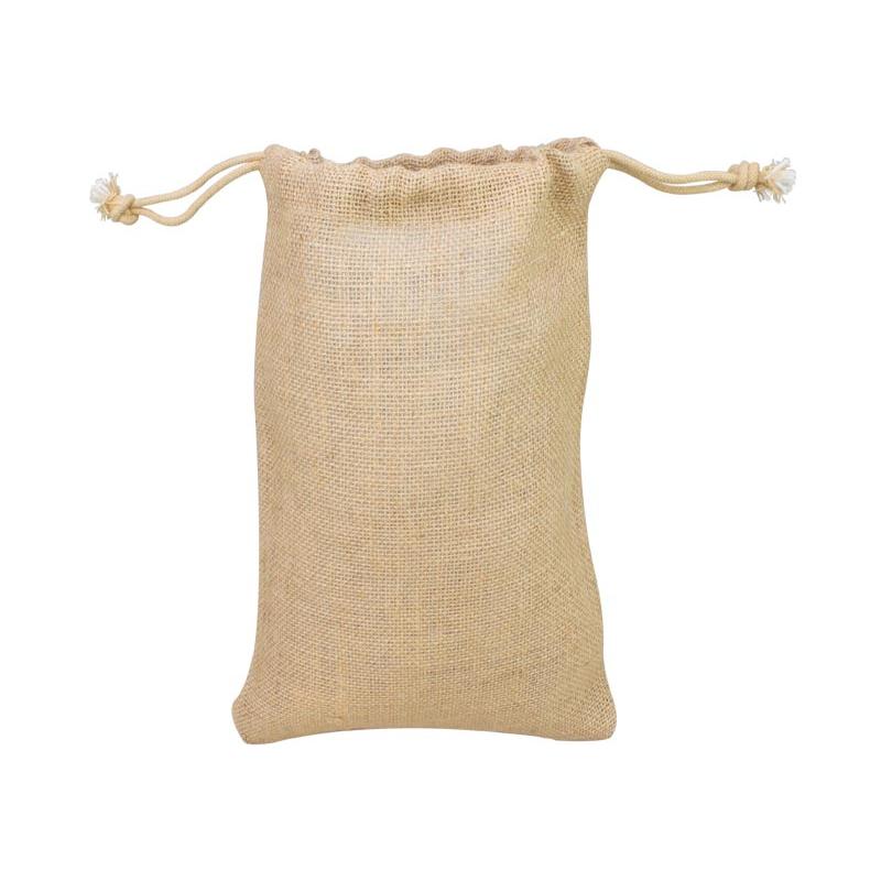 Bolsa de Yute tipo saco de 20 x 30 cm, sin recubrimiento laminado interior. Cuenta con asa-cordón retraíble de yute, en la parte superior de la bolsa.