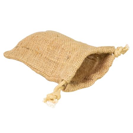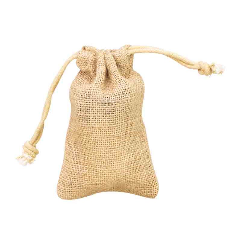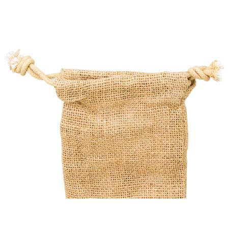 Bolsa de Yute tipo saco de 10 x 15 cm, sin recubrimiento laminado interior. Cuenta con asa-cordón retraíble de yute, en la parte superior de la bolsa.