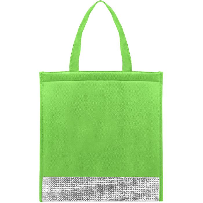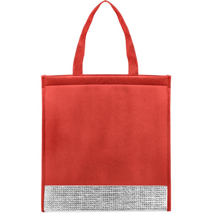 Bolsa térmica. Tamaño 32 x 33 cm. Fuelle de 14 cm. Non-Woven de 80 g. Espuma de PE y película de aluminio. Interior en material térmico recubierto en aluminio para mantener la temperatura. Cierre de velcro en la parte superior.