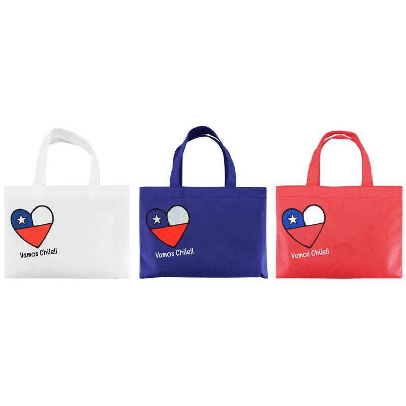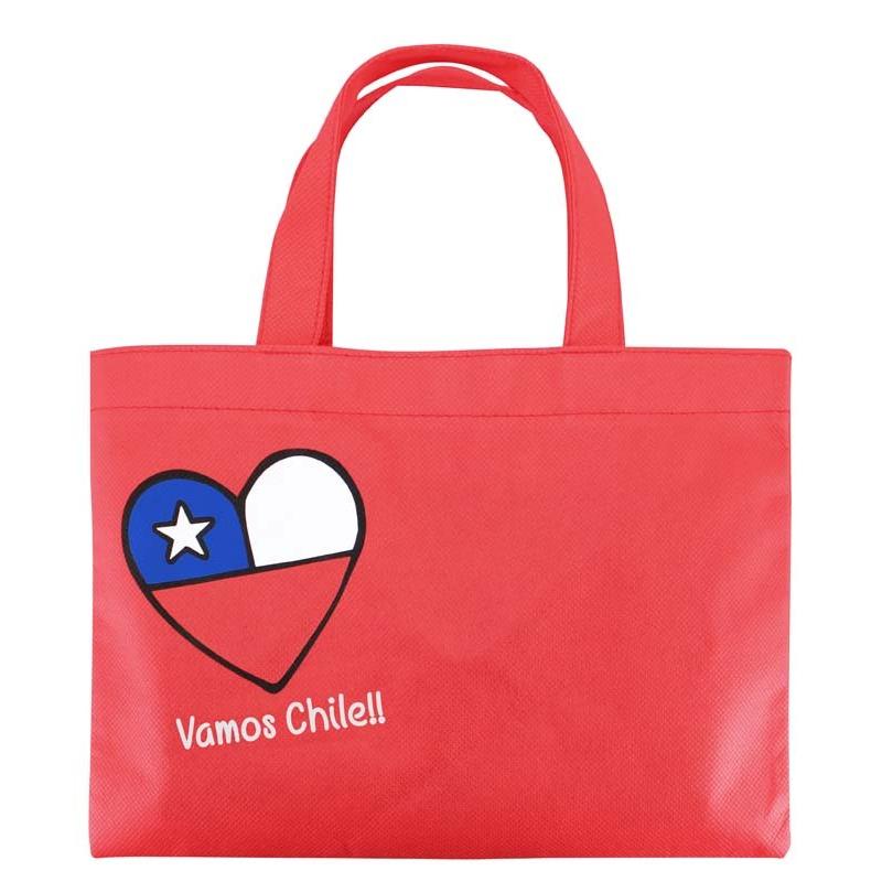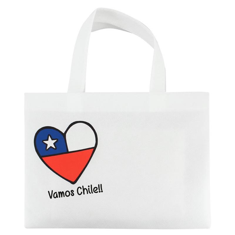 Bolsa reutilizable de Tela No Tejida (TNT) de 80 g/m2. Cuenta con 2 asas de 30cm. c/u aprox. Incluye impresión “Vamos Chile” a 3 colores, en el frente.