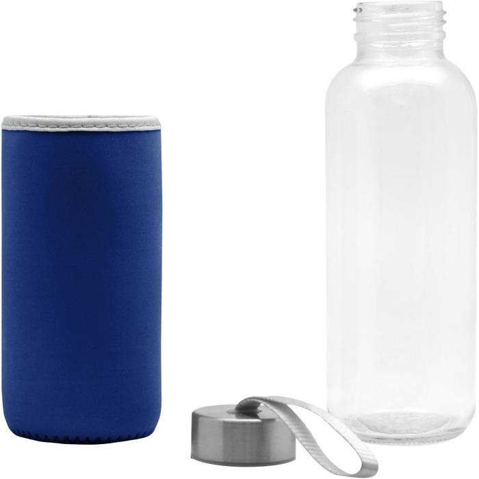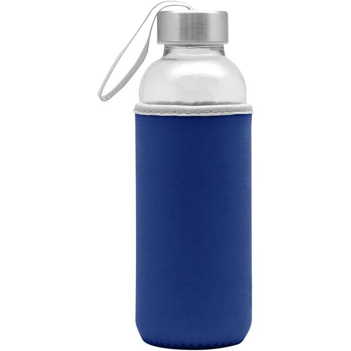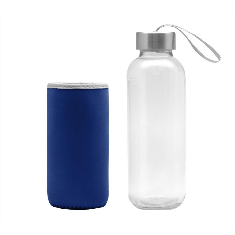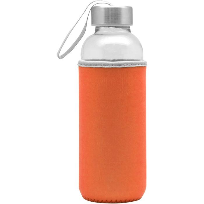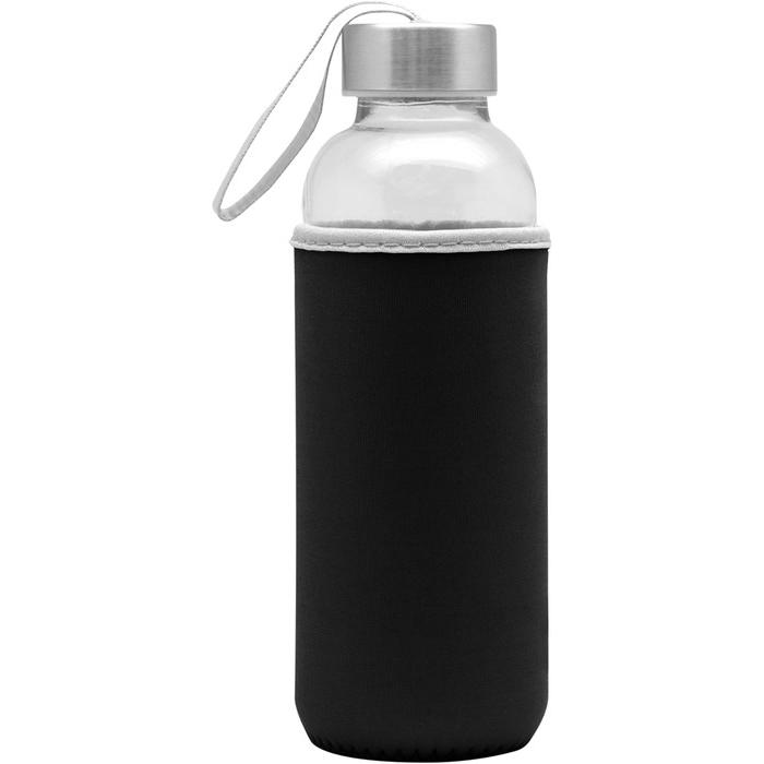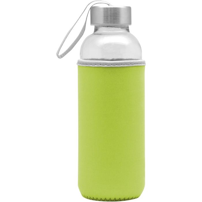 Botella Vidrio. Cuerpo traslúcido. Contiene funda de neopren que permite no calentar la bebida con las manos. Tapa de aluminio con tira de tela.
