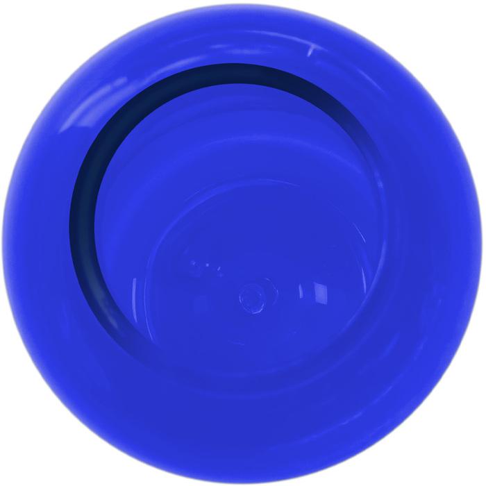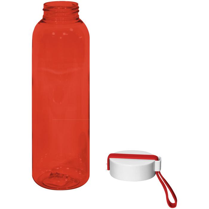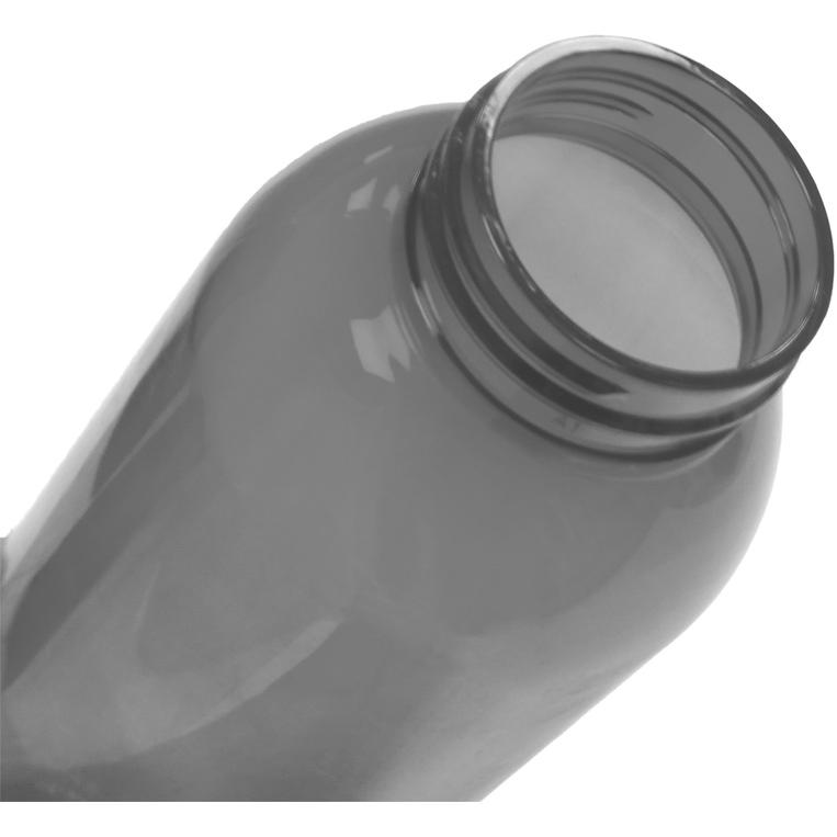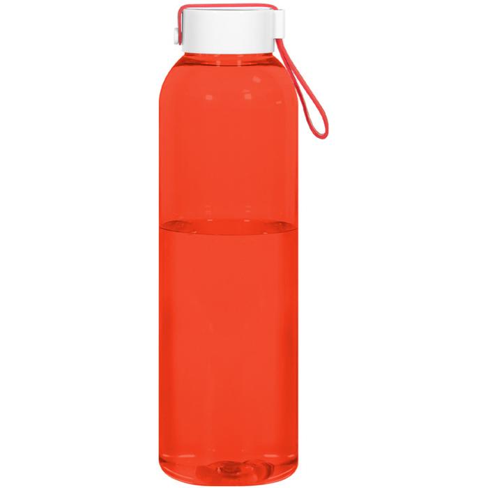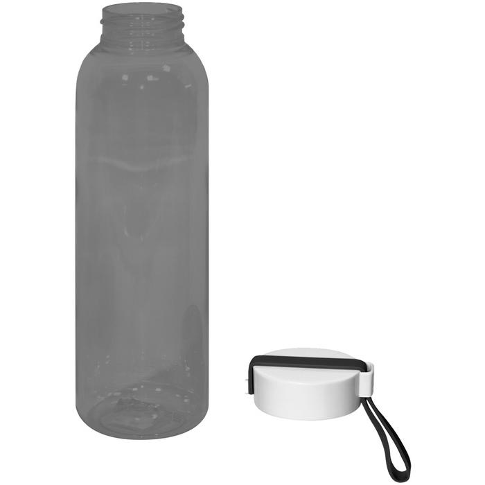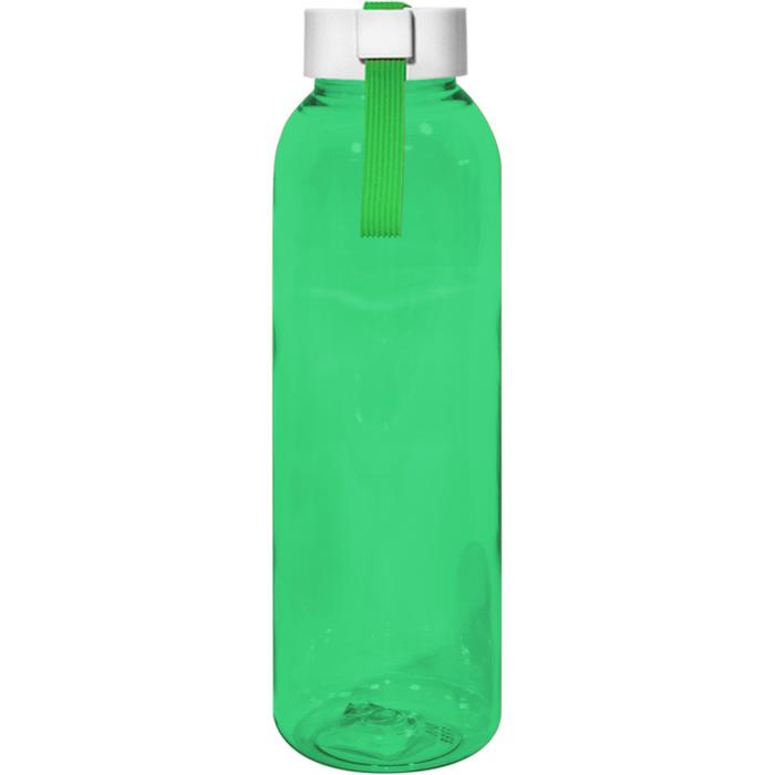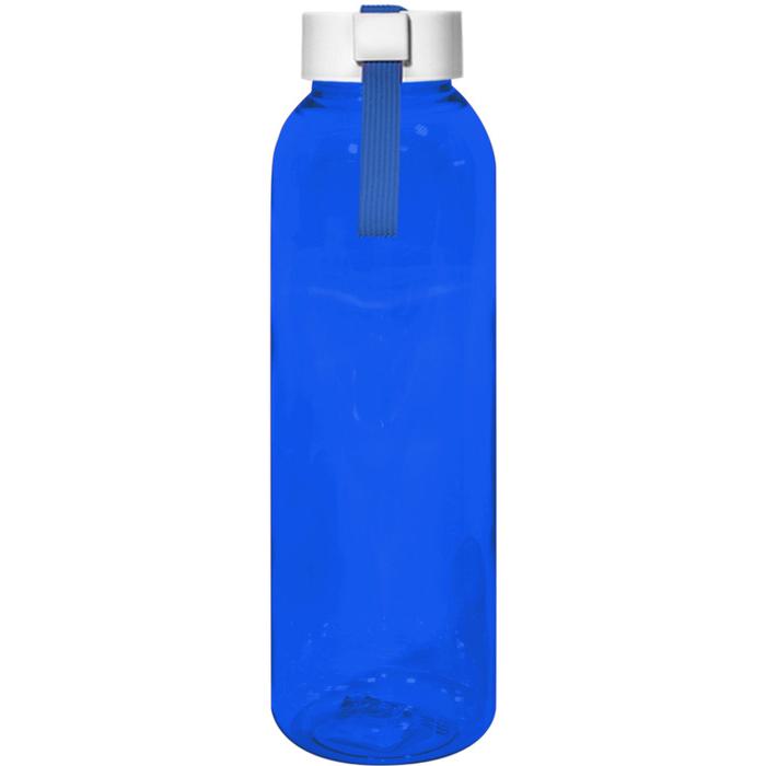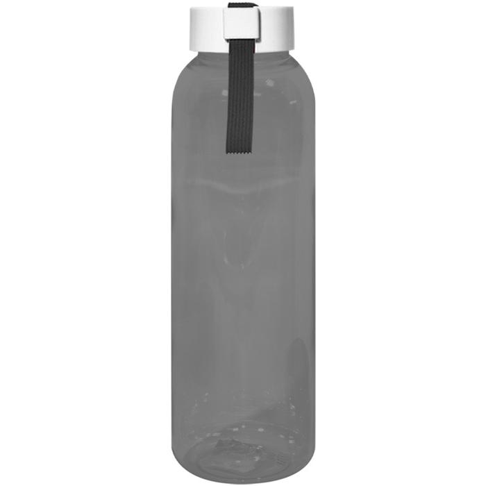 Botella de color translúcido con tapa a rosca plástica de color blanco con correa de silicona del mismo color de la botella.