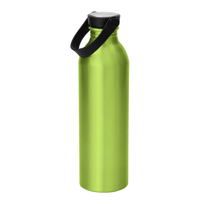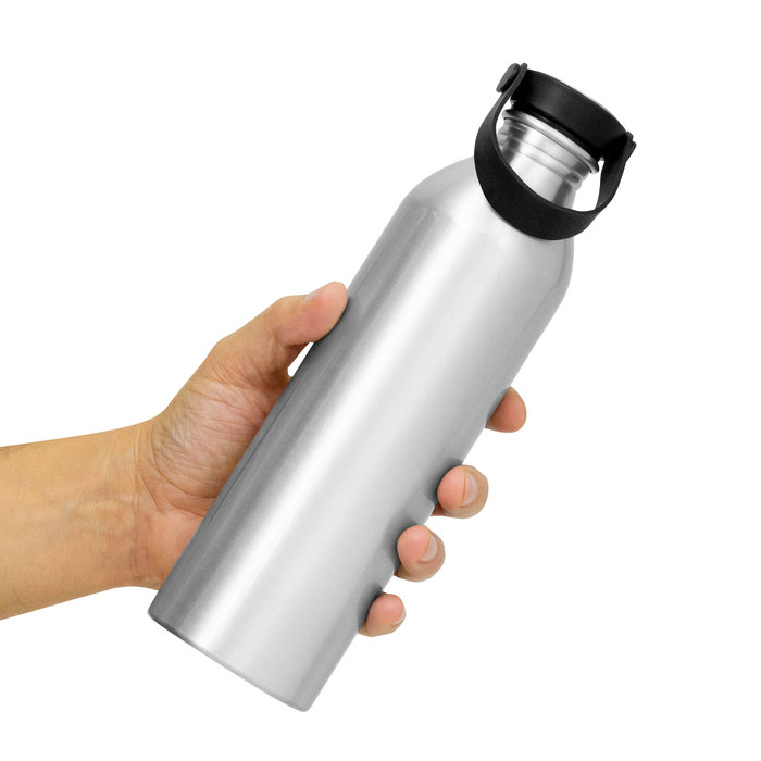 Botella de aluminio con acabado brillante. Tapa a rosca de acero inoxidable 201 y Polipropileno, con tira de silicona color negro.
