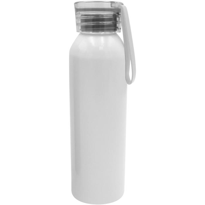 Botella de aluminio, cuerpo color blanco y tapa plástica translúcida con tira de silicona del mismo color de 8 cm de largo.
