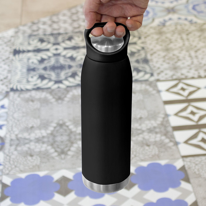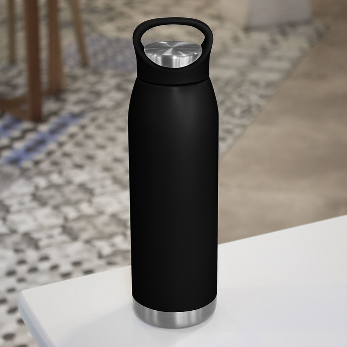 Botella doble pared, sellada al vacío. Tamaño Ø 7,6 x 26,5 cm. Capacidad 600 ml. Acero inoxidable. Botella con aislamiento térmico. Tecnología vacuum.Interior en acero 304 y exterior en acero 201. Pintura en colores mate. Tapa combinada en plástico del mismo color de la botella y acero inoxidable 201. Mantiene hasta 12 hs la temperatura de las bebidas calientes y 24 hs de las bebidas frías. Presentación en caja de regalo.