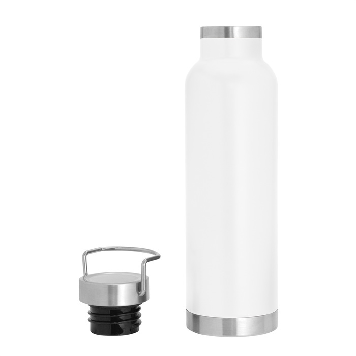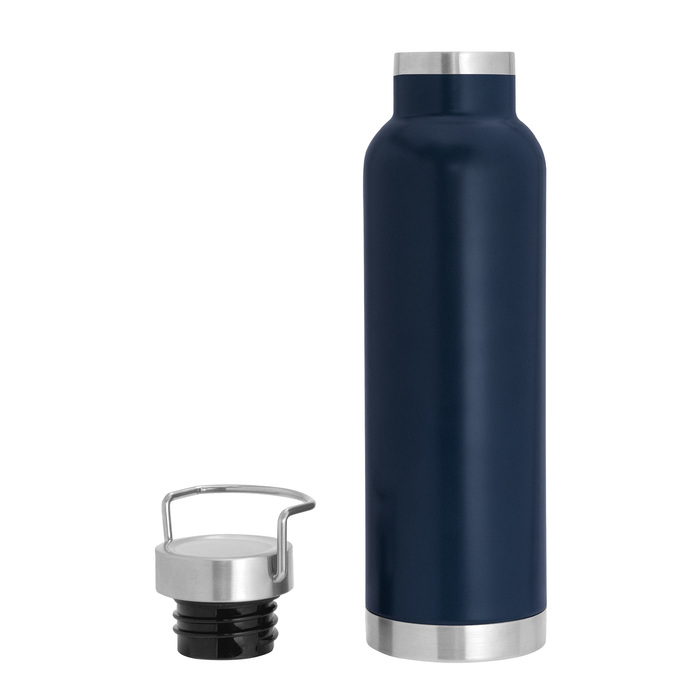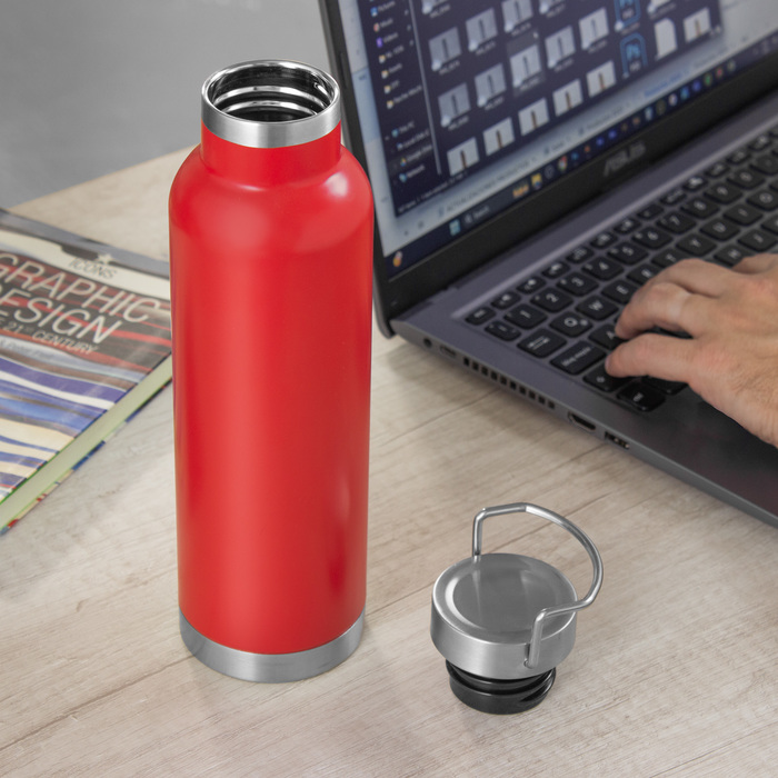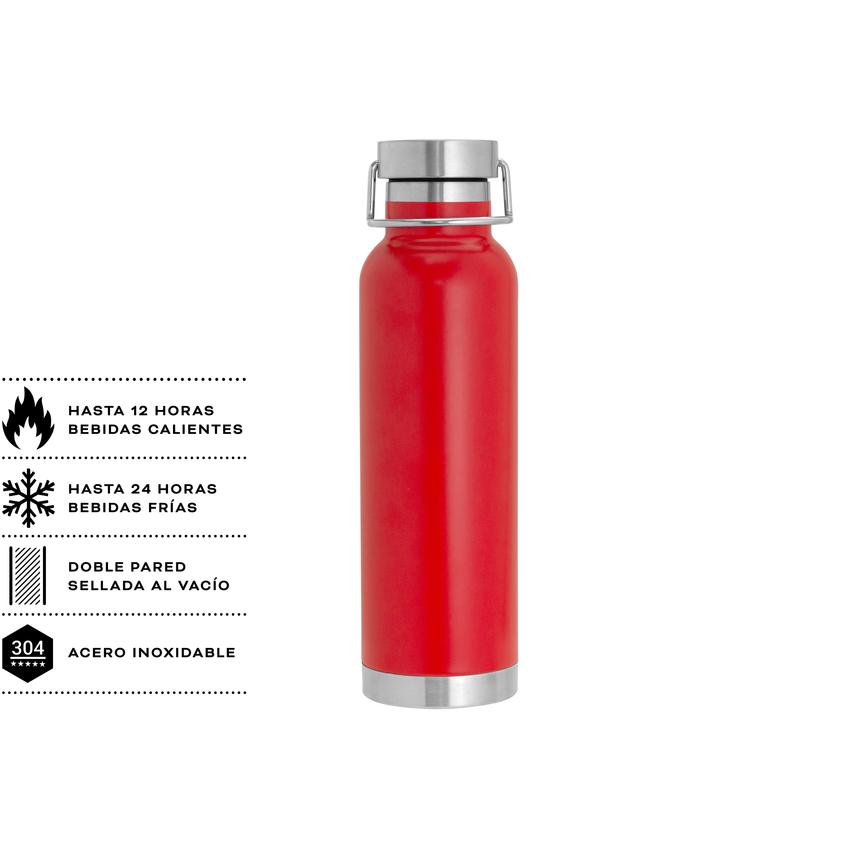 Botella doble pared, sellada al vacío. Tamaño 7,3 x 26 cm. Capacidad 650 ml. Acero inoxidable. Interior en acero 304 y exterior en acero 201. Tapa de acero a rosca con manija rebatible metálica . La medida de este termo es tan practica que con el tendras el liquido necesario para estar hidratado en el momento del día que elijas. Mantiene hasta 12 hs la temperatura de las bebidas calientes y 24 hs de las bebidas frías. Presentación en caja de regalo.