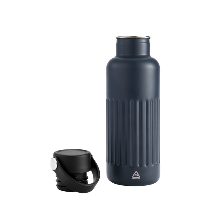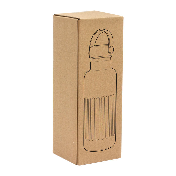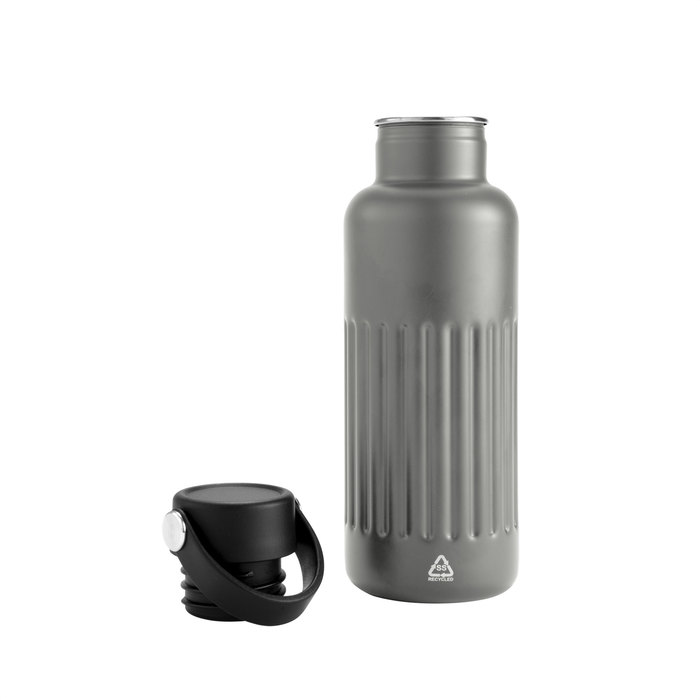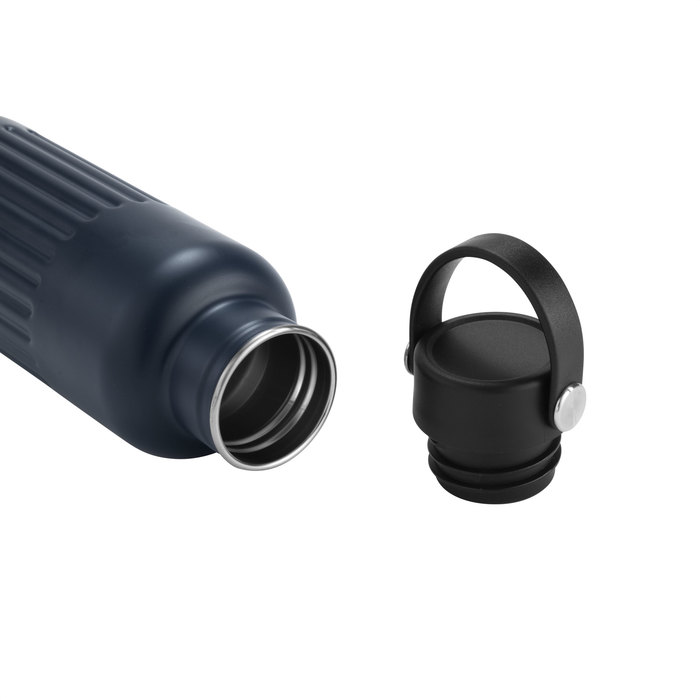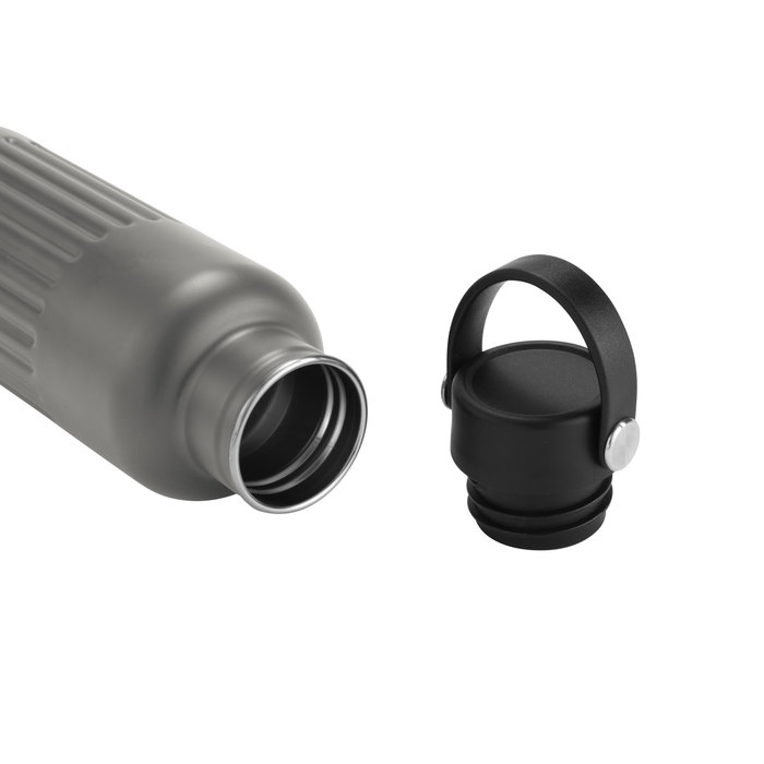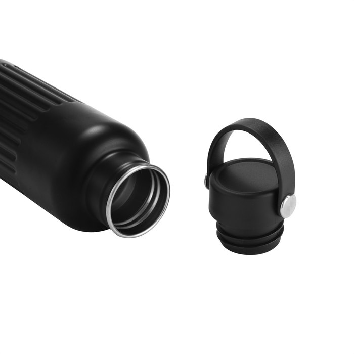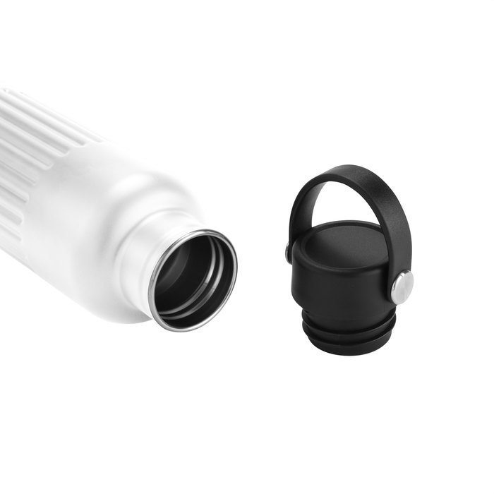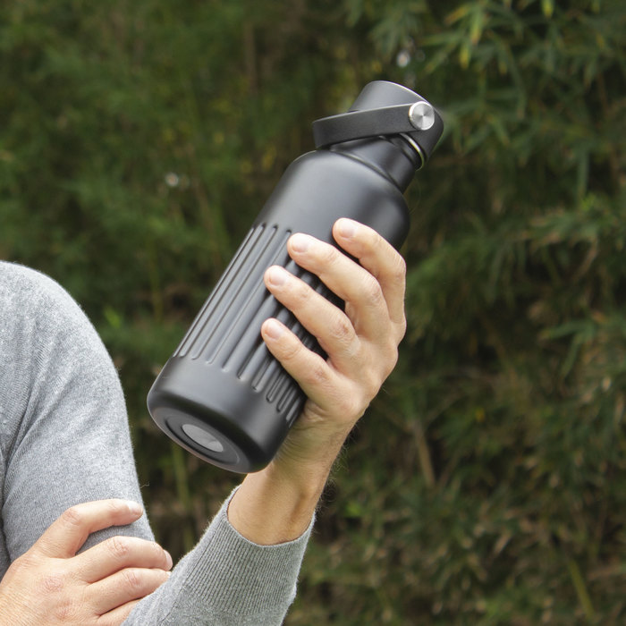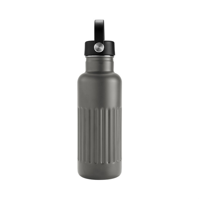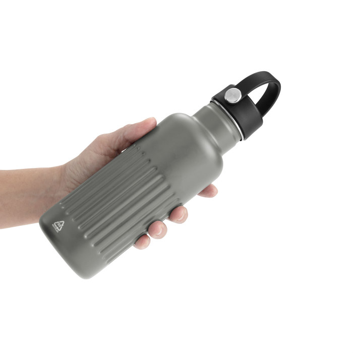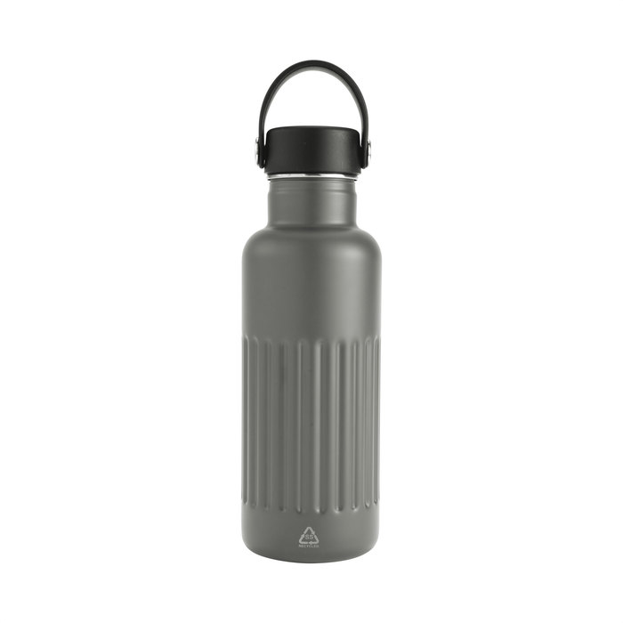 Botella doble pared, sellada al vacío. Botella con aislamiento térmico. Tecnología vacuum. Interior de acero 304 reciclado y exterior de acero 201. Tapa a rosca de polipropileno, interior plástico. Asa reforzada de silicona. Pintura acabado semi mate. Cuerpo texturado para un mejor agarre. Mantiene hasta 12 hs la temperatura de las bebidas calientes y 24 hs de las bebidas frías.