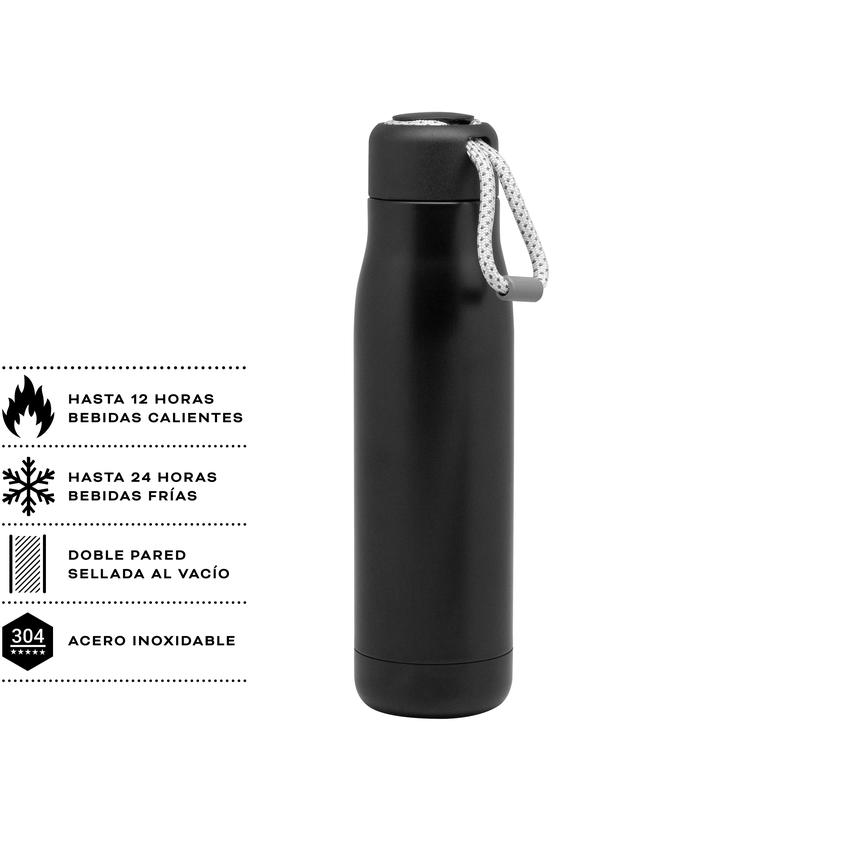 Botella doble pared, sellada al vacío. Interior de acero 304 y exterior de acero 201. Tapa plástica PP y anillo de silicona. Posee además tira de color gris de 12 cm de largo. Ideal para llevarla a todos lados. Mantiene hasta 12 hs la temperatura de las bebidas calientes y 24 hs de las bebidas frías.