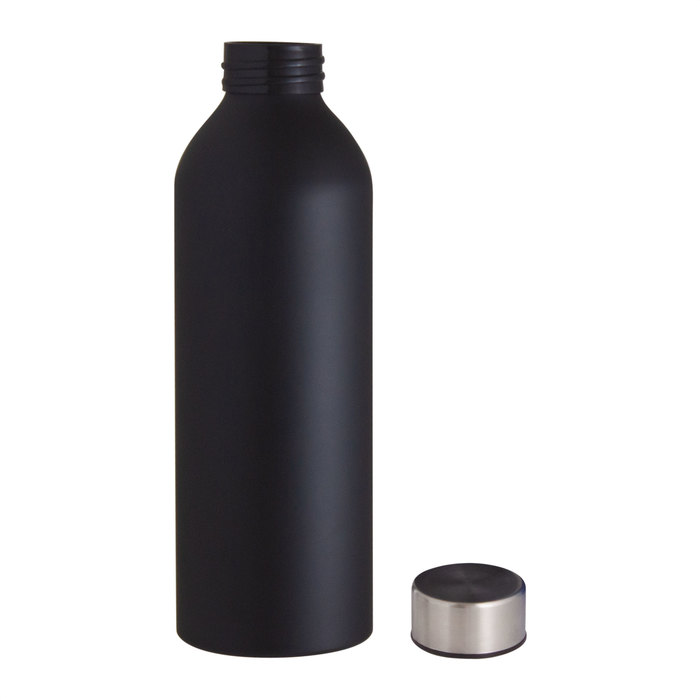 Botella de aluminio con acabado mate. Tapa a rosca color plata en acero inoxidable 201 y anillo de silicona antiderrame.