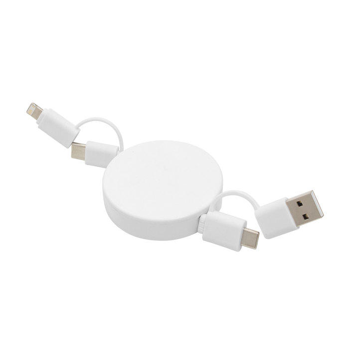 Cable de carga retráctil con longitud de hasta 90 cm. Carga y transferencia de datos de alta velocidad. Carga rápida de 65W. Entrada 2 en 1: USB y USB-C. Salida: 2 en 1: Lightning y USB-C. Diseño con acabado mate