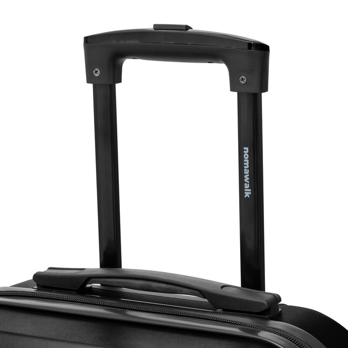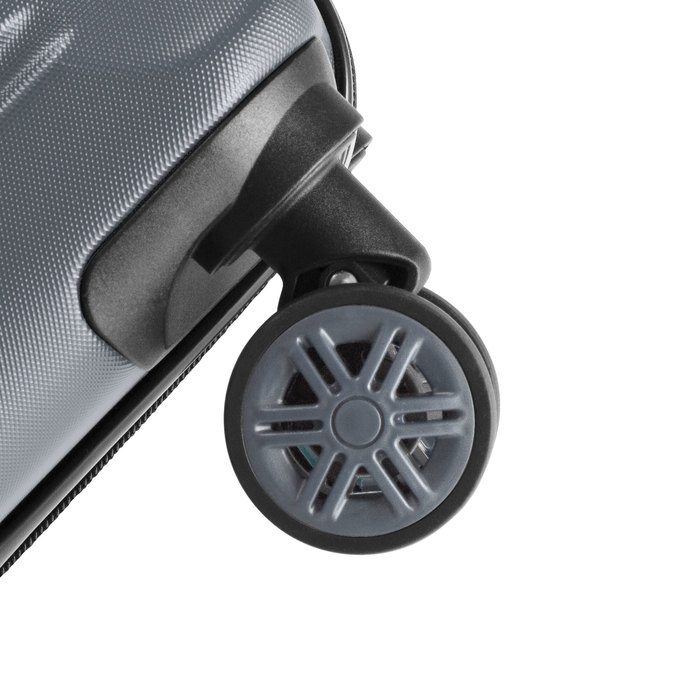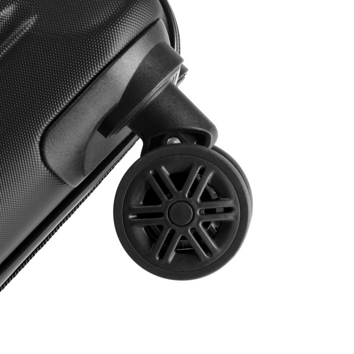 8 ruedas con giro 360°. Manija de transporte reforzada y engomada. Mango extensible hasta 48 cm. 2 posiciones. Interior: 2 compartimentos principales con cierre y elásticos ajustables.