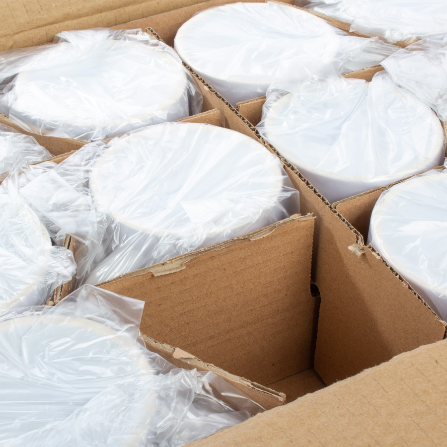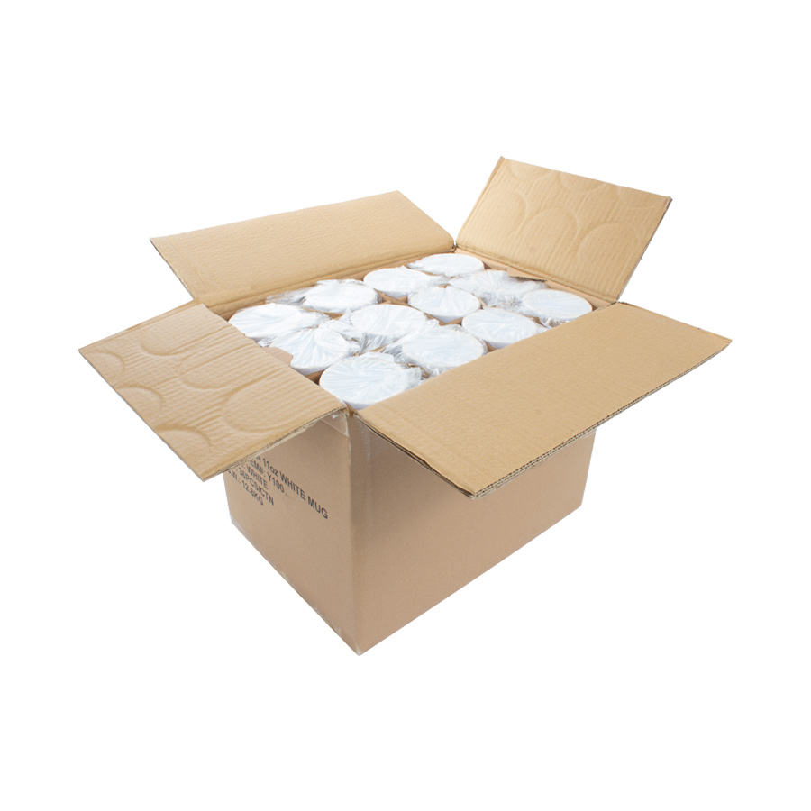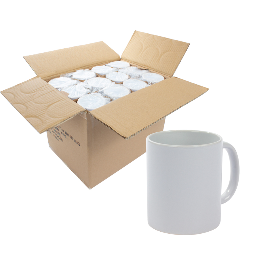 Cartón con 36 tazones cerámicos extra-blancos para sublimación. Presentación unitaria en bolsa plástica transparente, con separadores de cartón dentro de la caja (no incluye caja individual).