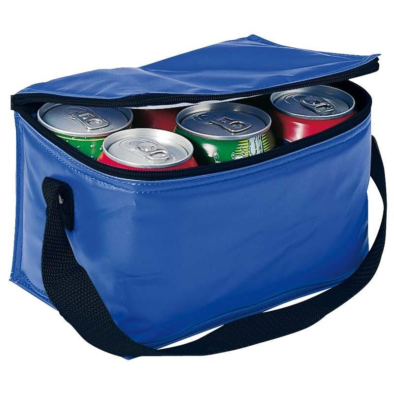 Cooler para 6 latas de bebidas o cervezas, también utilizable como lonchera. Tela exterior 420D/PVC Poliéster. Tela interior PVC metalizado aislante.