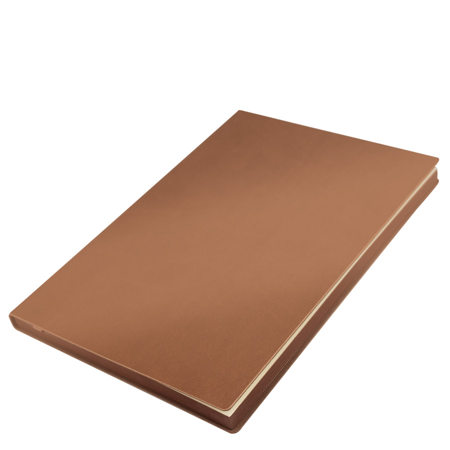 Cuaderno tamaño A5, con cubierta de PU eco-cuero de 2mm de espesor y lomo pintado de color al tono. Interior 80 hojas lineadas amarillas de 80gsm. Incluye banda separador de hojas al tono. Presentación individual en bolsa de polipropileno.