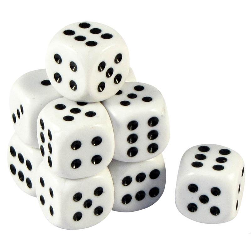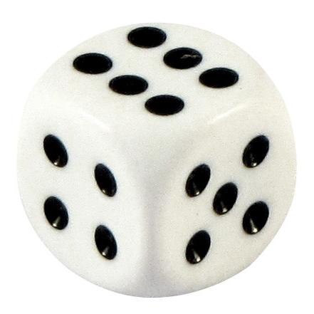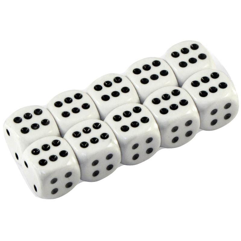 Dado de juego, extra-blanco, con puntos negros. Presentación en paquetes de 10 unidades.