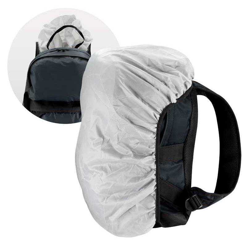 Deluxe Mochila modelo “XD” en tela impermeable polyester 840D, incluye 1 bolsillo frontal, 1 bolsillo lateral, 1 bolsillo porta-accesorios en uno de los tirantes y cordón elástico multiuso. Incluye capucha impermeable de polyester en la parte superior trasera.