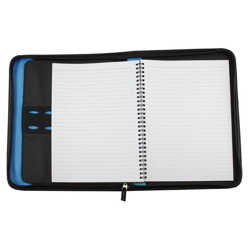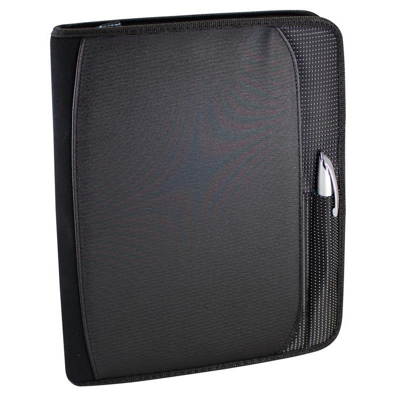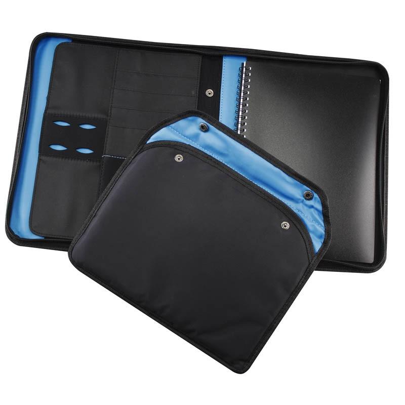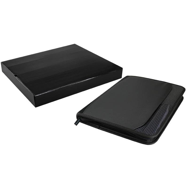 Para el Ejecutivo de hoy. Deluxe Portafolio modelo “President” con Bolso Porta-Tablet removible. Incluye Cuaderno de 50 hojas lineadas, compartimentos para tarjetas, bolígrafo, documentos y celular. Cierre cremallera. Material PU + Polyester 1680D.