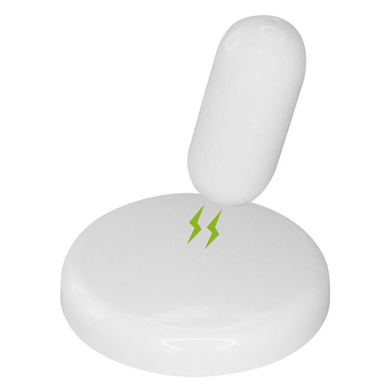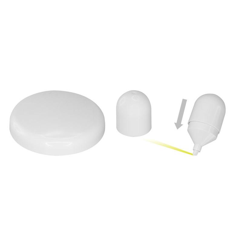 Destacador amarillo “Cápsula” blanca, sobre base plástica blanca. Cuenta con sistema imantado que sostiene la cápsula de pie sobre la base, estabilizándola como “mono porfiado”. Amplia área de impresión tanto en la cápsula como en la base. Presentación en caja de regalo blanca. Importante: presionar la punta sobre papel por 3 segundos para que la tinta amarilla baje.