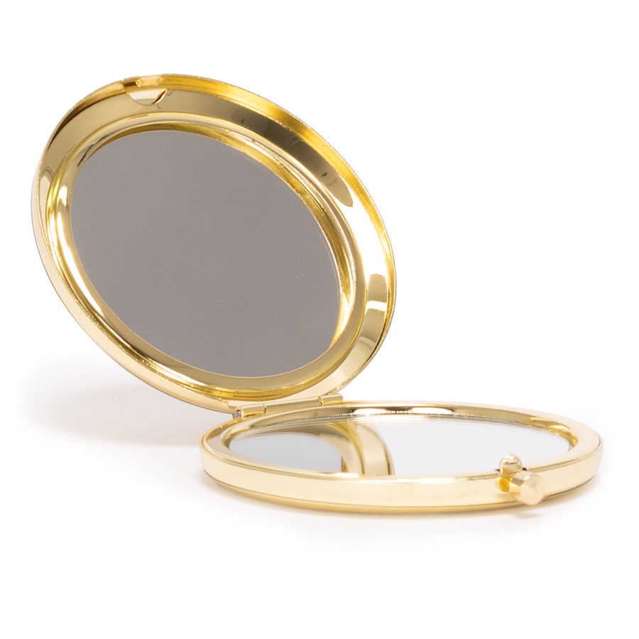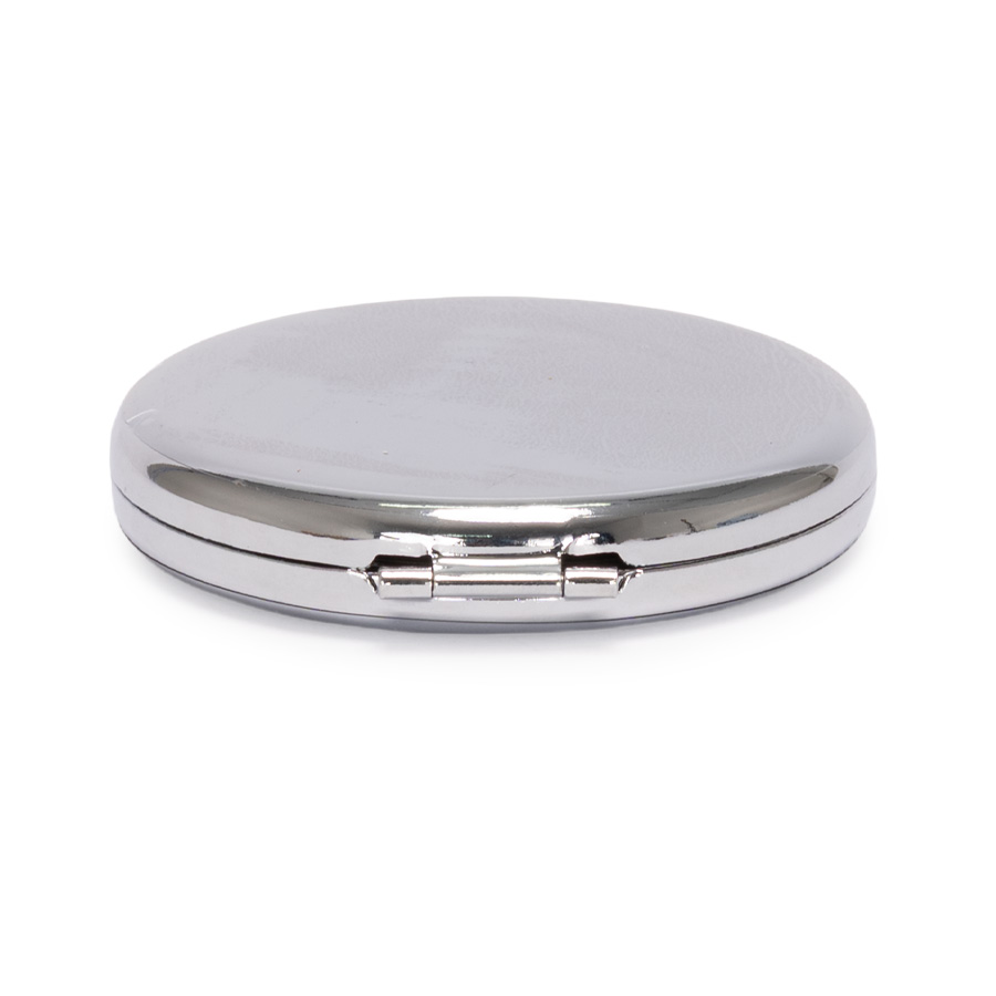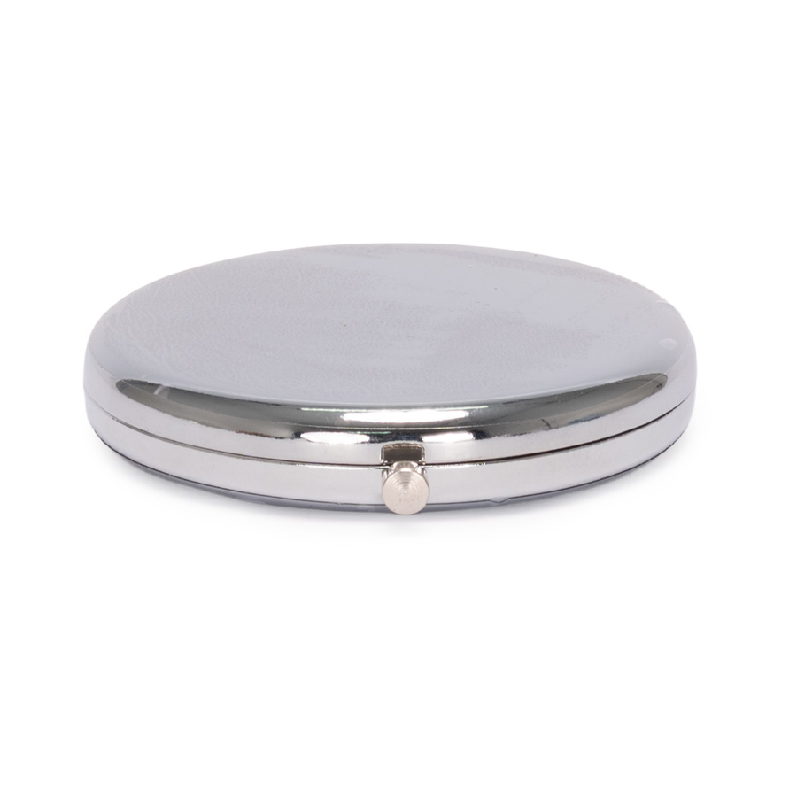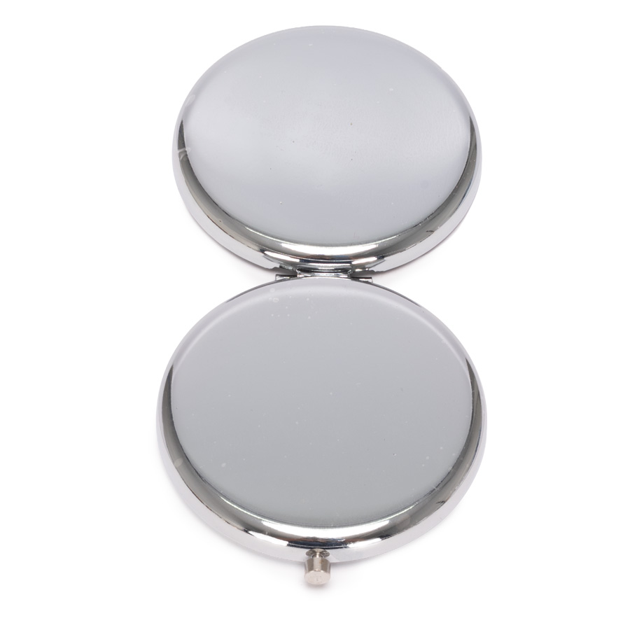 Espejo metálico de Acero inoxidable redondo doble. Interior con 2 espejos: uno normal, el otro con aumento. Presentación en bolsa espuma frozen + caja de cartón laminado negro. IMPORTANTE: este espejo viene con sellos plásticos en ambas caras exteriores, para protegerlo de manchas y rayaduras. Antes de imprimir o grabar logo, preocúpese de retirar los sellos plásticos.