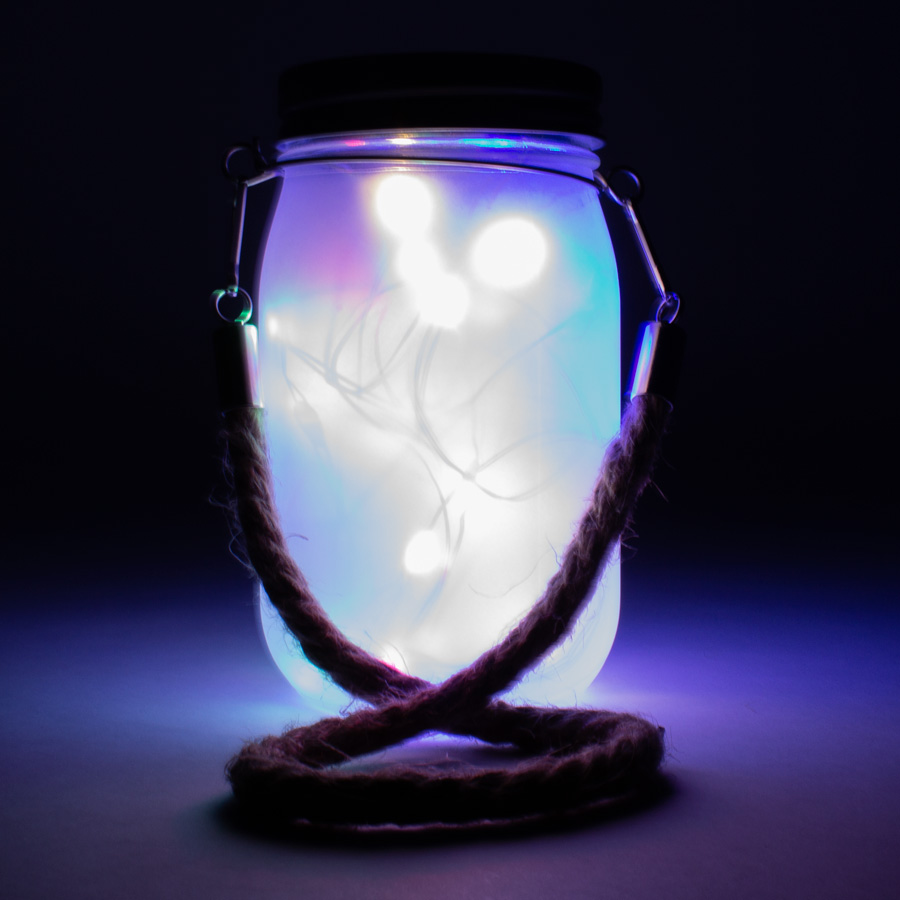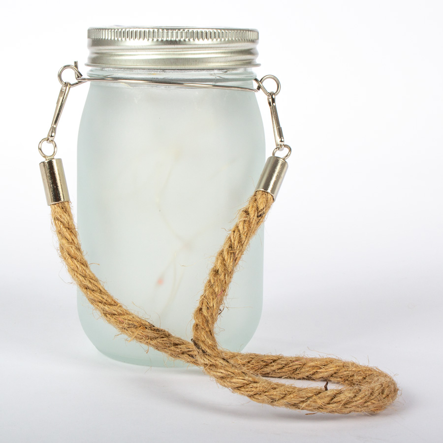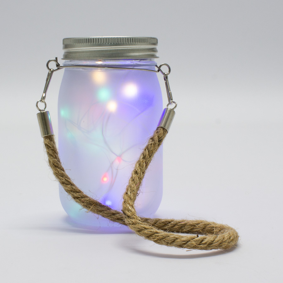 Farol para colgar, con forma de frasco y con tapa. Incluye cable con luces LED en el interior, que cambian de color. Sobre la tapa, contiene panel fotosensor, que permite que las luces LED se enciendan automáticamente cuando baja la luz-día. Las luces permanecerán encendidas por un lapso de 3 horas aproximadamente.