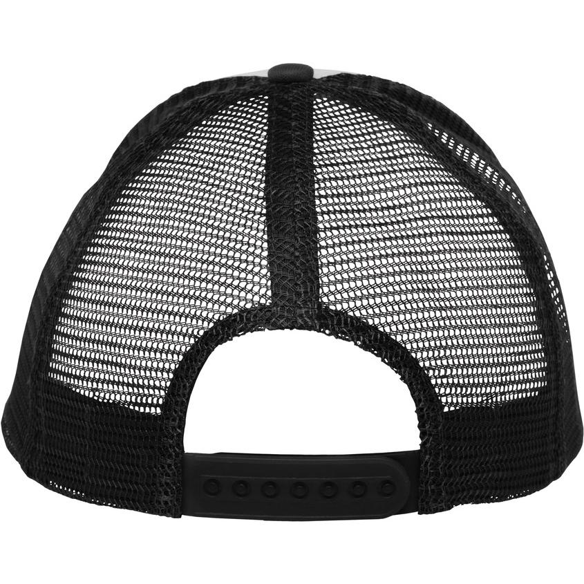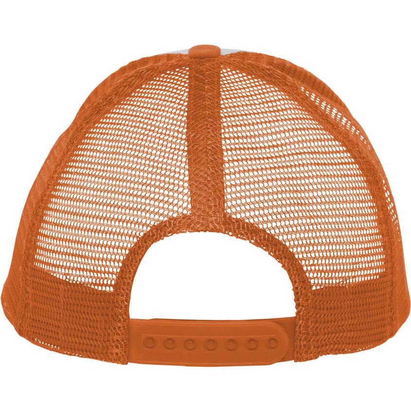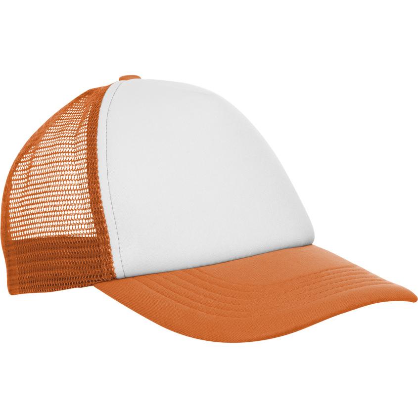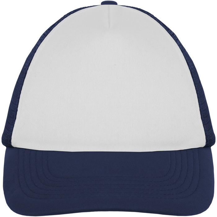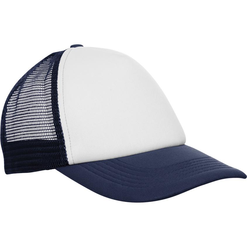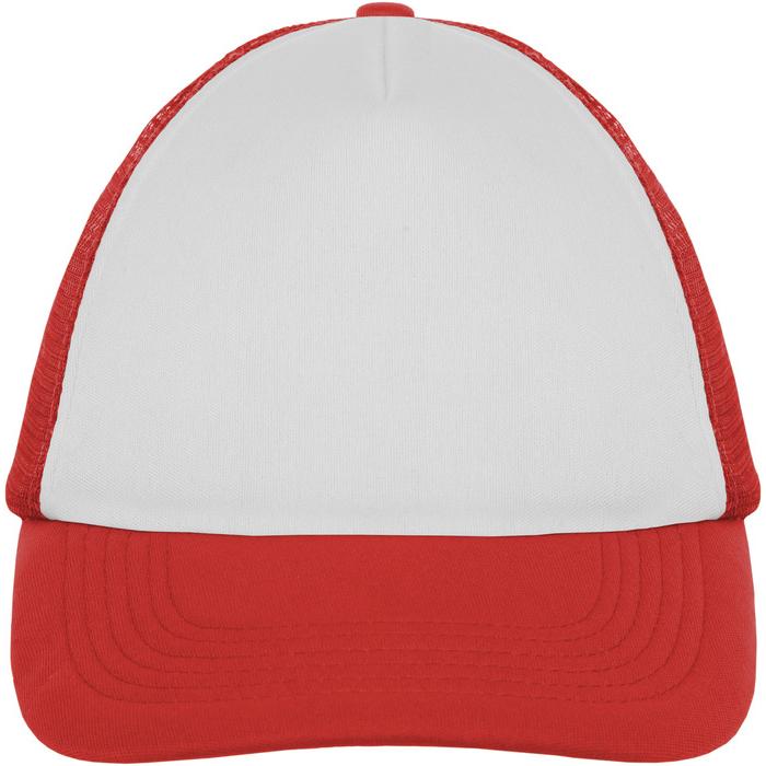 Gorra trucker 5 gajos. Tamaño: Ancho de base 18 cm. x alto 16 cm. Poliéster. Frente de color blanco. Parte trasera con tela red de color. Ajuste con broche plástico. Seis costuras 17,5 x 7,5 cm.