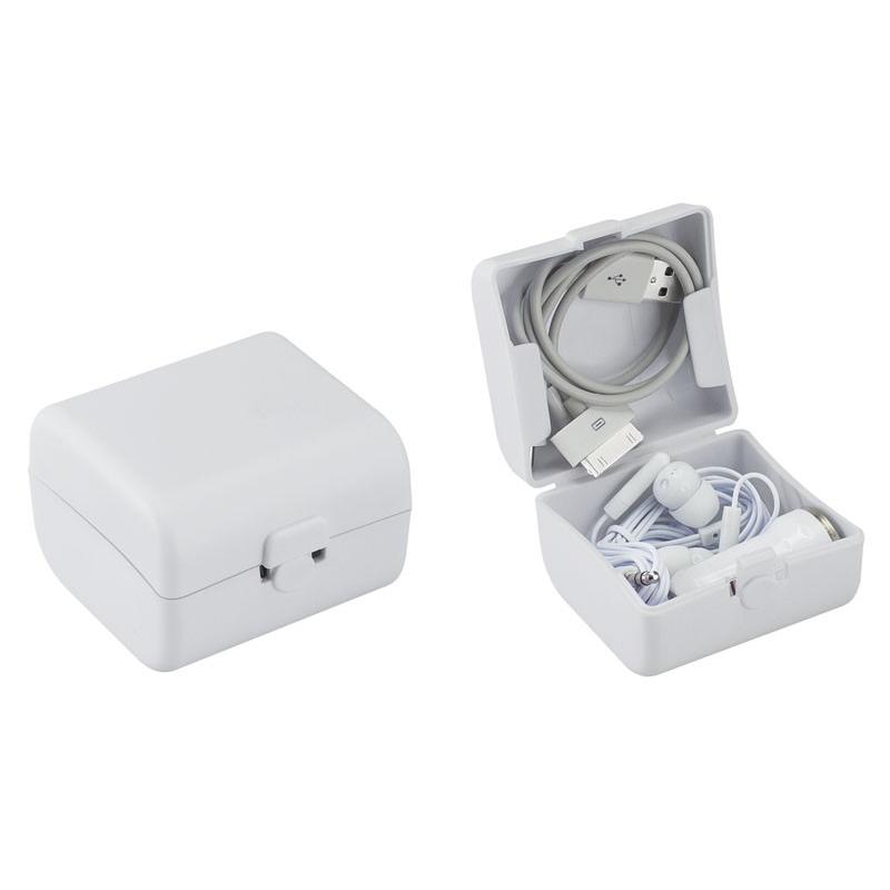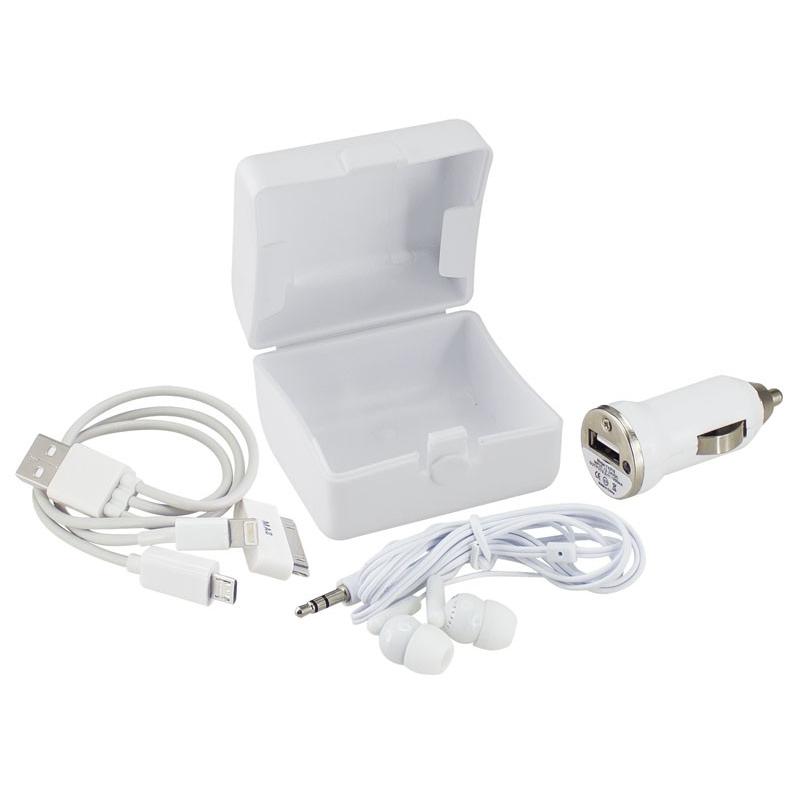 Kit de Carga y Audio. Contiene cargador USB para encendedor / toma de corriente del automóvil, auriculares blancos y multi-cable adaptador USB con 3 terminales para celulares y tablets. Un kit de emergencia indispensable. Presentación en caja plástica blanca.