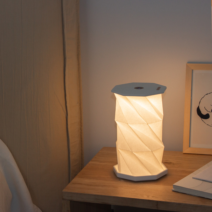 Lámpara giratoria plegable. Permite 3 posiciones de diferentes alturas. Luz led cálida. Botón táctil de encendido/apagado que regula la intensidad de la luz. Batería de litio recargable. Conexión USB-C. Incluye cable de carga de 1 m. de largo color blanco.