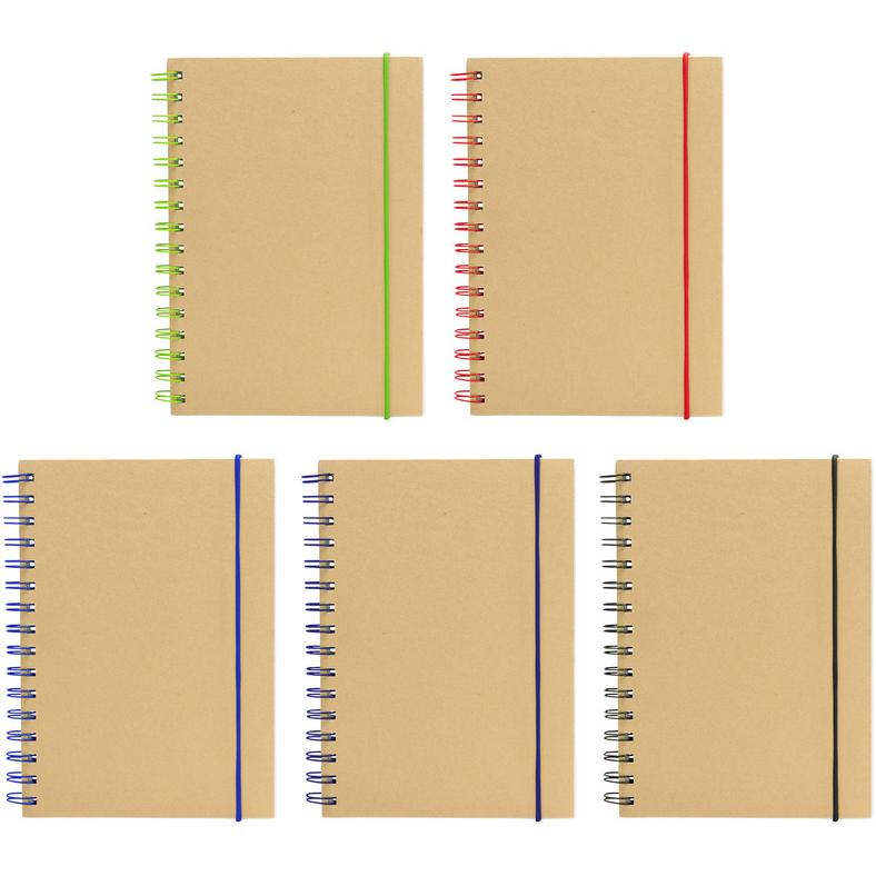Libreta espiralada. Tapa recubierta en papel kraft de 120 g. Interior de 70 hojas blancas rayadas de 80 g. Cierre con banda elástica y espiral del mismo color.