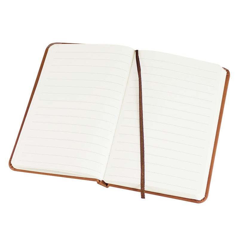 Libreta tamaño A6, con cubierta de cartón piedra forrada en PU simil cuero de 3mm de espesor. Interior 80 hojas lineadas amarillas de 80gsm. Incluye banda separador de hojas al tono. Presentación individual en bolsa de polipropileno.