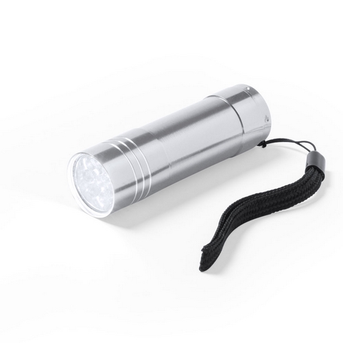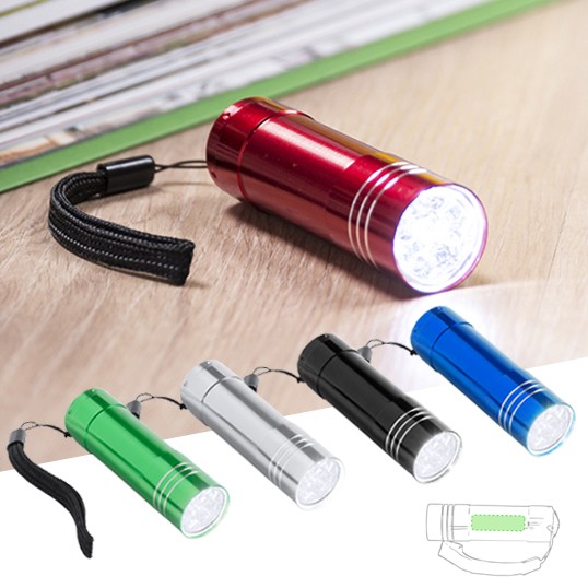 Linterna de 9 ledes de alto poder de iluminación. Con resistente cuerpo en aluminio, pulsador protegido con recubrimiento de resistente goma y cinta de transporte. Alimentación a pilas: 3xAAA no incluidas. Presentada en caja individual.