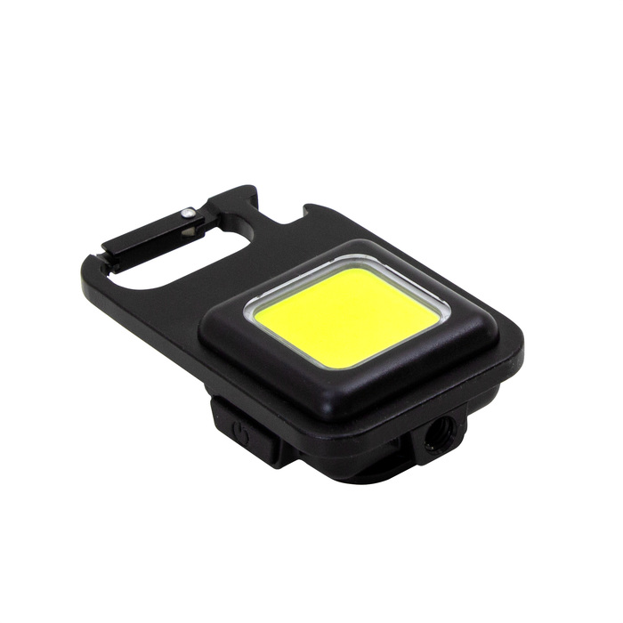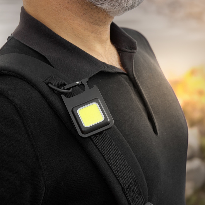 Linterna portátil recargable. Con destapador y mosquetón incorporado. Imán al dorso y soporte con pie para diferentes posiciones. Luz led de alta potencia: 3 intensidades de iluminación (alta, baja e intermitente). Batería recargable de 300 mAh. Luz led indicadora de carga. Puerto USB-C y cable de carga de 30 cm de largo color negro.