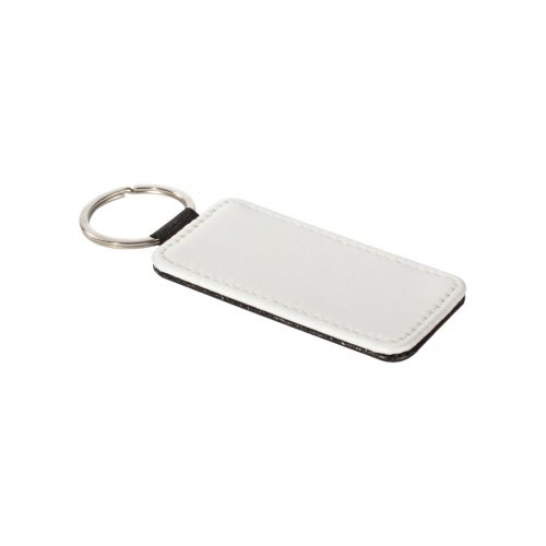 Llavero cuadrado de PU blanco para sublimación. Reverso capa PU negro con brillo (no sublimable). Argolla de Acero inoxidable.